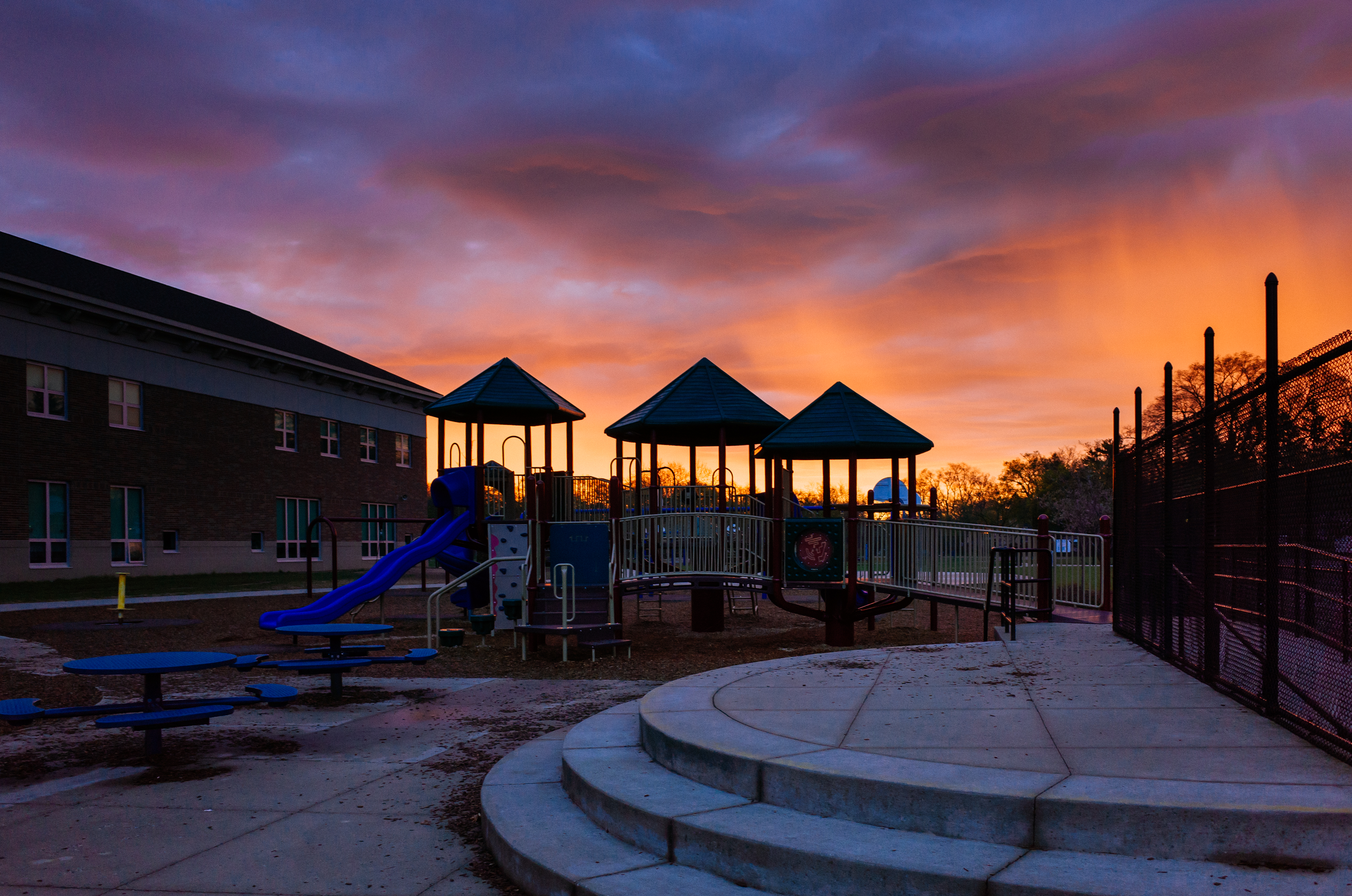 The last picture in the gallery is one from today, shadows from a couple huge oak trees on my street, stark agaisnt the grass and street/sidewalk in the bright sunlight, the school in the sunrise pictures in the background.