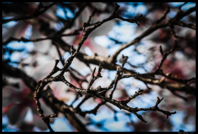 As you can see, I eventually went with a picture focused on the branches of a tree, with the colorful Magnolia flowers of the tree and the sky in the background blurred. I called it “Ode to Pollock” because it reminded me of Jackson Pollock’s splatter paintings. It is not an easy picture to look at; it’s jangly and chaotic. But I think it holds together.