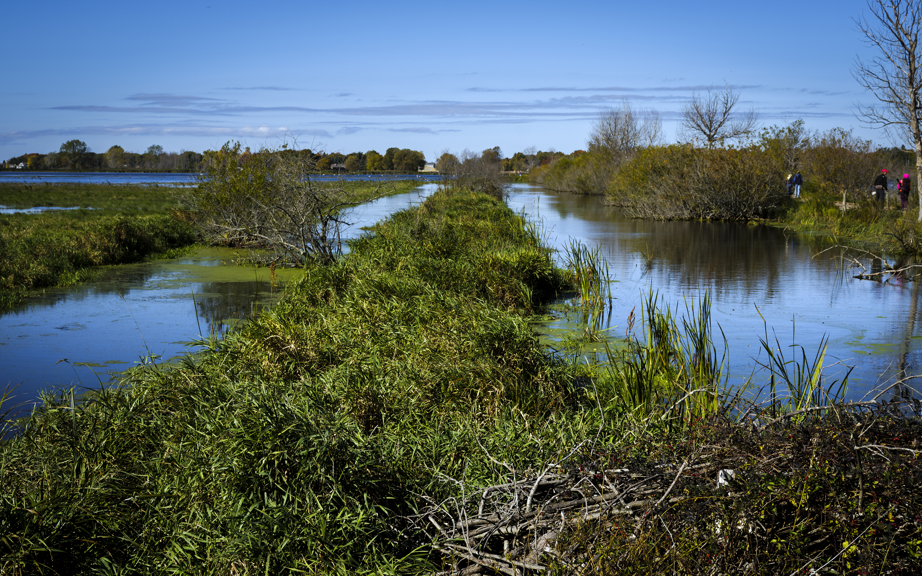 Some people were there to look at birds. One guy had a monster telephoto lens that he was using to spy on birds in the distance. I dutifully took a shot of some swans closer by. I also took some shots of the very green plants set against the very blue sky and water. Nature was being very pretty.