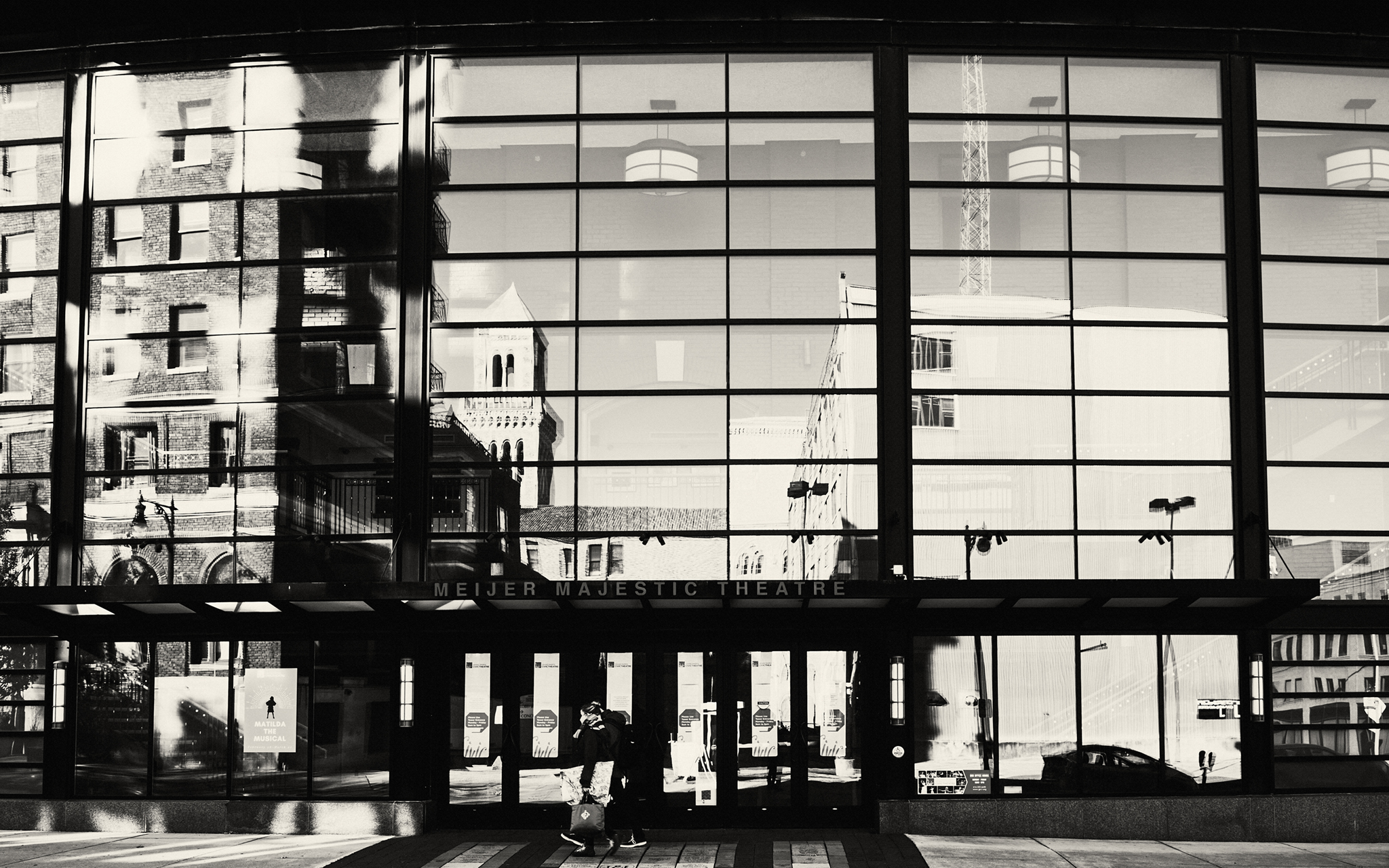 It made for some forceful images. The first three all involve the steeple of the Fountain Street Church in Grand Rapids. Two are reflections in the windows of the Meijer Majestic Theatre–i.e., the Grand Rapids Civic Theatre; one is the steeple itself.