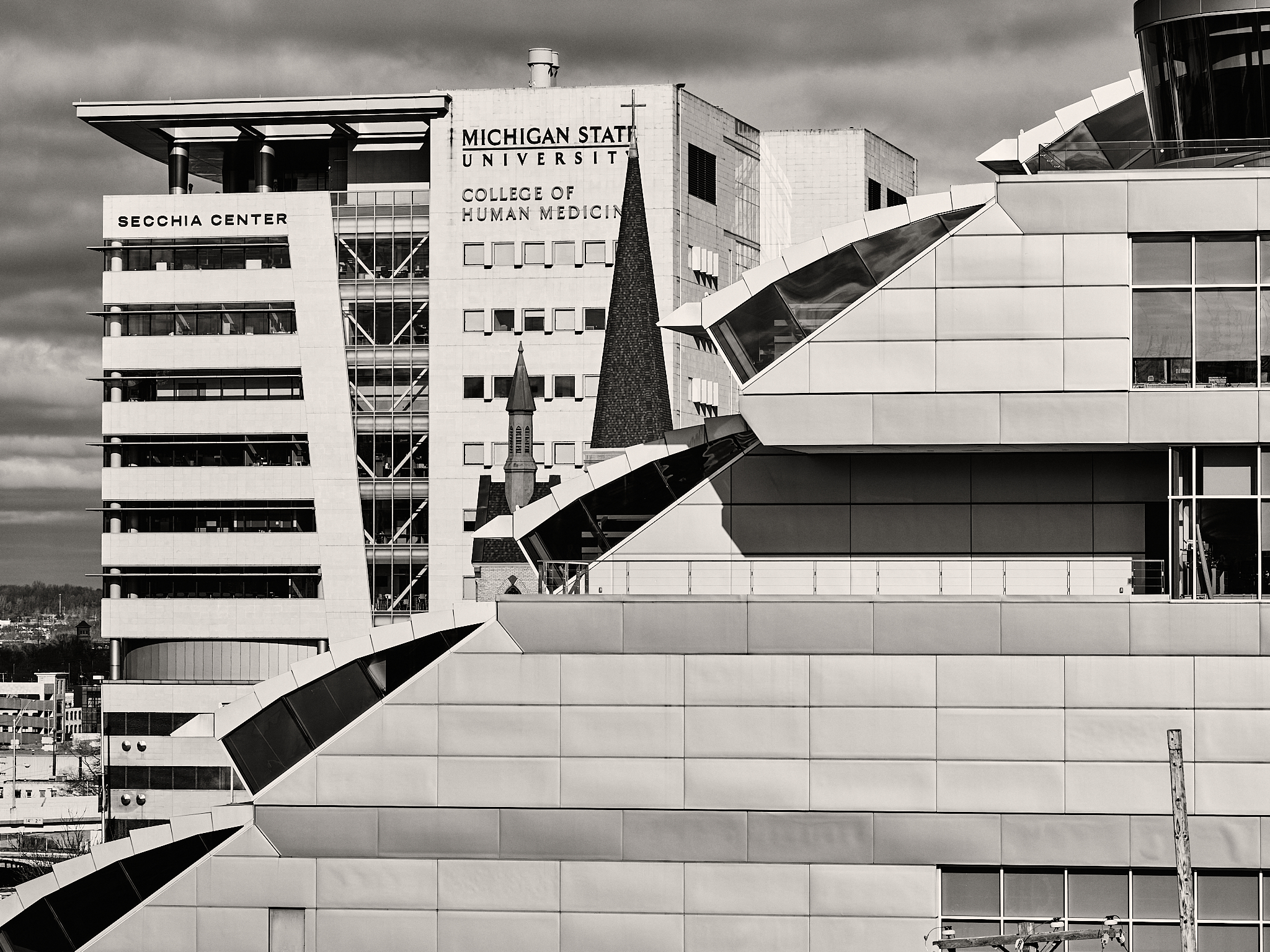 Finally, two images that hark back to the past couple of weeks (see below). One is of the steeples of the Lutheran Church, glimpsed behind the huge Van Andel Institute building.