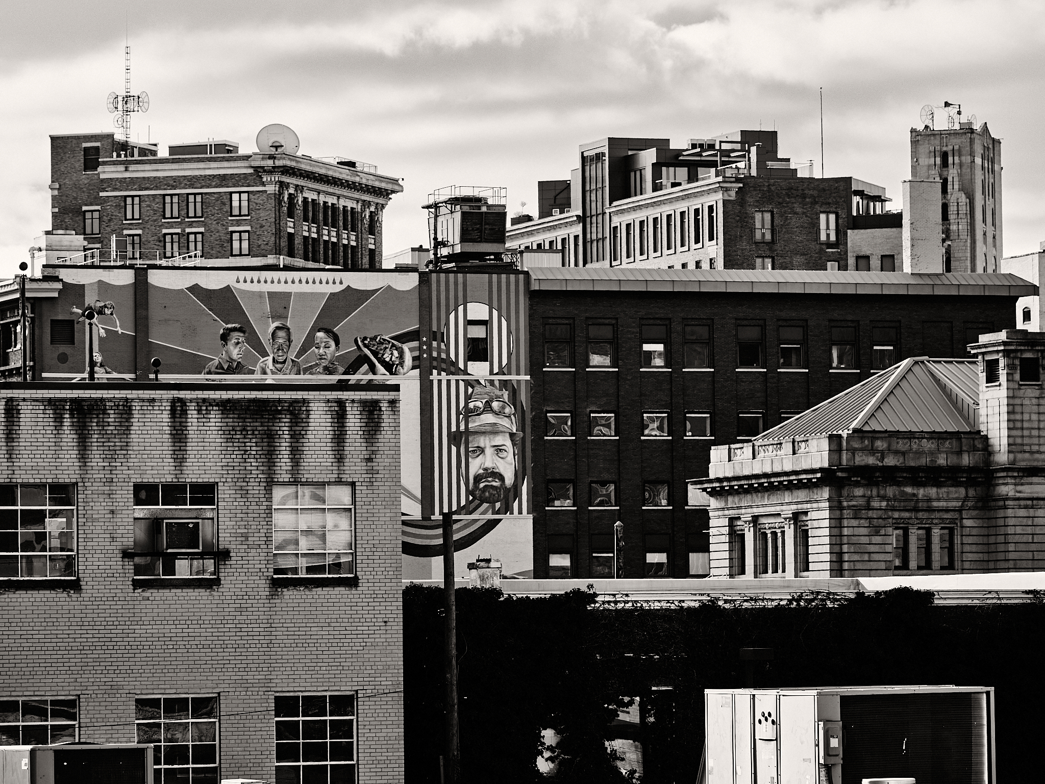 You can see the larger context for this view in a few of the shots of the same section of the downtown area that I took from the rooftop parking area. The first one is all context, showing a mix of older and newer architecture. The second I liked because of the compressed, jumbled look of the buildings. With the third it’s the dappled light on the north face of the building.