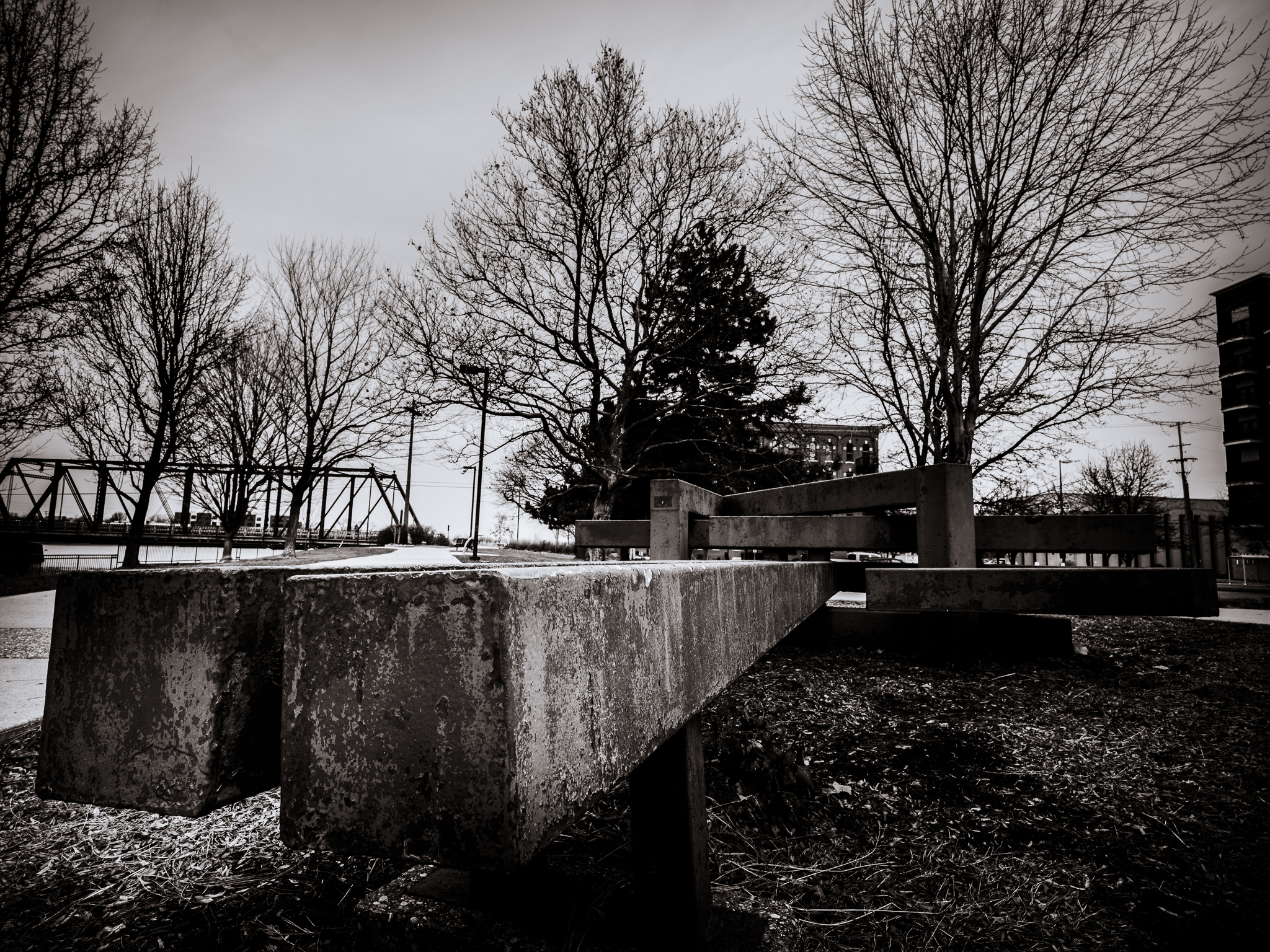 The first set of images is the same one processed two different ways. A cafe in Ada Village, a few miles east of Grand Rapids. One version of the image is in black and white, and I’ve left a hint of the angle of view distortion in the final. The other is in color, and I’ve mostly been able to get rid of all distortion. The exception is the corner where the walls meet. It looks much bigger than it is, and corner looks triangular rather than square. Try a close up image of a person’s face with a wide angle lens–such as your cell phone–and the big nose look will illustrate what I mean. The image that follows is of a piece of art in the park near the Sixth Street Bridge. It has that big nose effect going big time.
