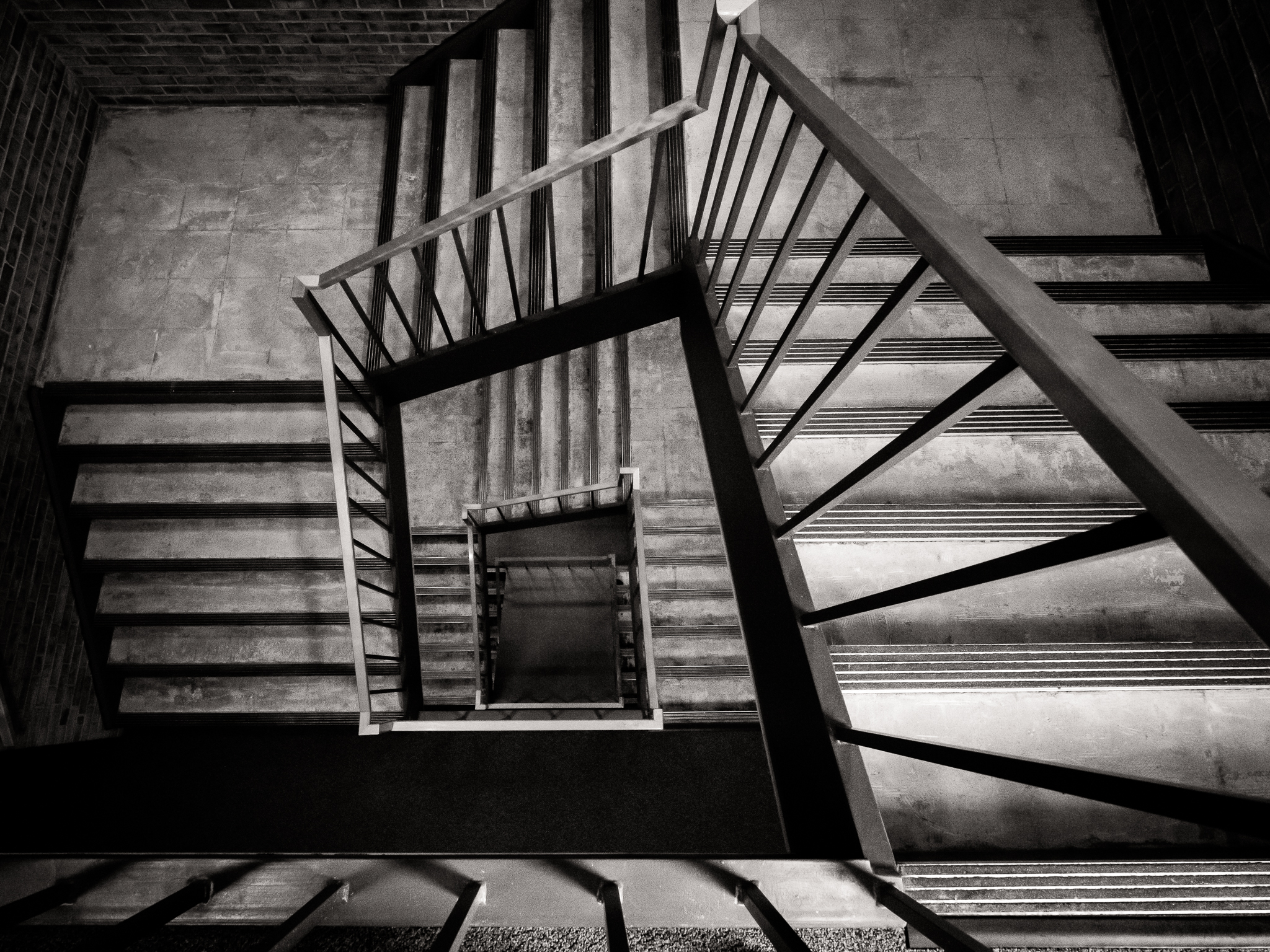 The next set of two images is the cover image replayed. These are actually two different images of the same staircase in the Hekman Library at Calvin University. I was looking down from the fifth floor. The first, the cover image of the blog post, is in black and white. The second is in color, to highlight the leading line of the handrail on the staircase. There’s a second difference, a detail you’ll notice it if you look carefully at the bottom of the image. I did it on purpose, if you’re curious.