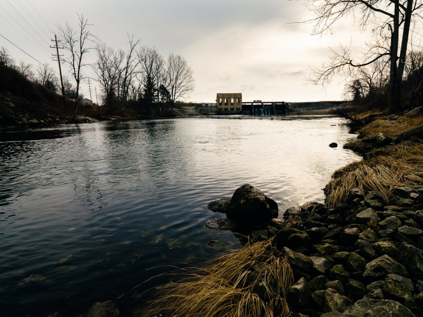You can see a bit of distortion in the brick building portion of the dam, and more in the utility poles on the left. I had the camera pretty close to perfect alignment, but not quite. It would have been an easy fix in Photoshop but I decided not to bother.