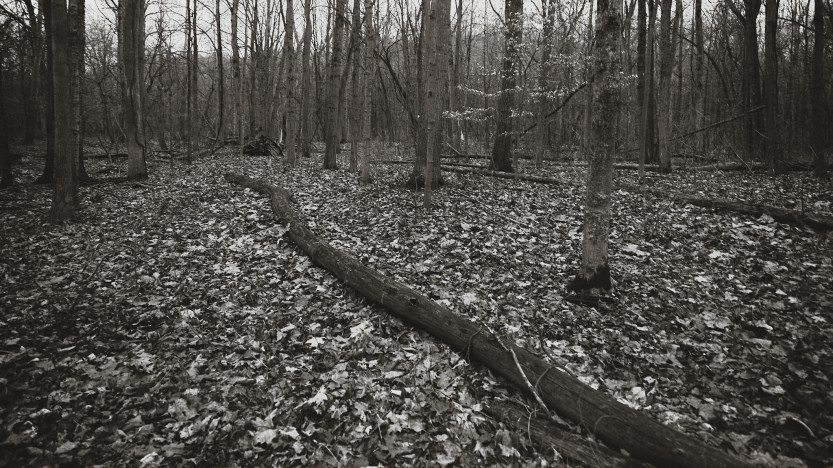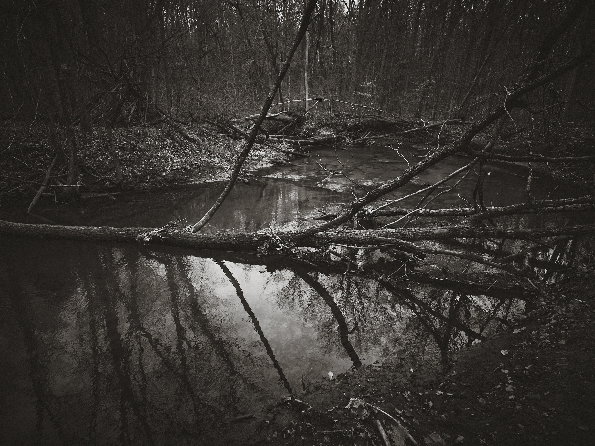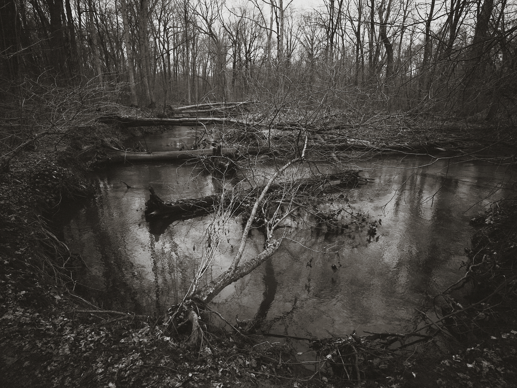Finally, a few bits of life. The first image below is what I mean by “life.” The leaves are dead of course. But in black and white they nonetheless are luminous and hold out the promise of next springs new life. I paired the second with it (the post’s cover image) because of the bright leaves on the small tree on the life. I made that image, however, because of the path leading down the ravine and the sharp bend in the creek that you see. Context for what characterizes Aman Park.