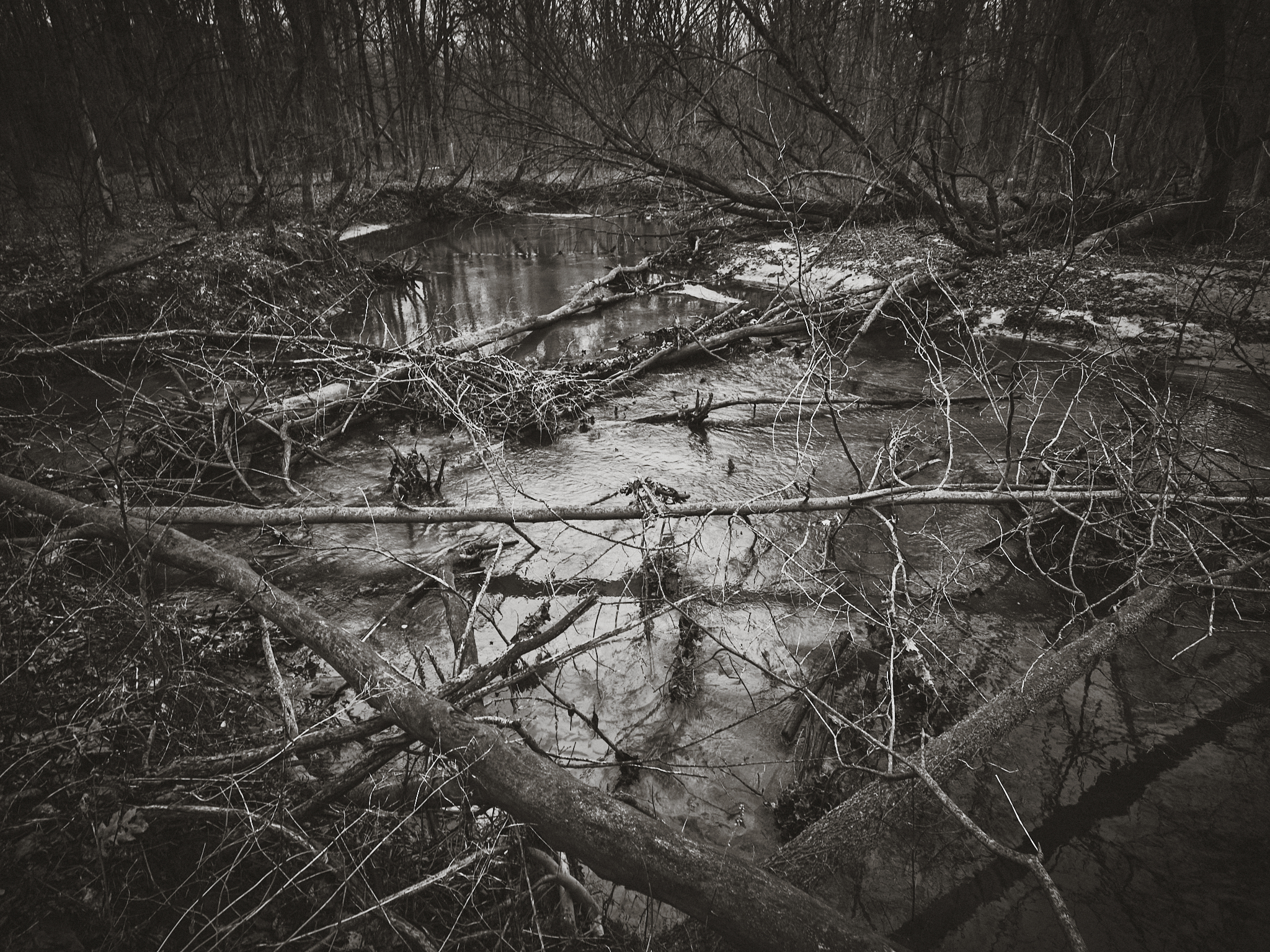 The next two images are a bit random. Tree branches piled on the bank of the creek, with a small island in the middle of the creek. And coniferous shrubs, presumably piled up by Kent County parks staff or volunteers (and not large beavers). I like the two images for the visual details and for the mix of order and chaos.