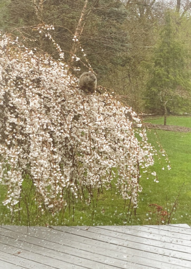 A ground hog in a tree, eating the spring flowers on the branches, with a bunny on the ground stretching up to do the same. Yes, that happened. The hardest rain, for about 15 minutes, that I’ve seen in a long time, overwhelming the gutters on my house. Spring showers, “check.” And flowers. Beautiful flowers.