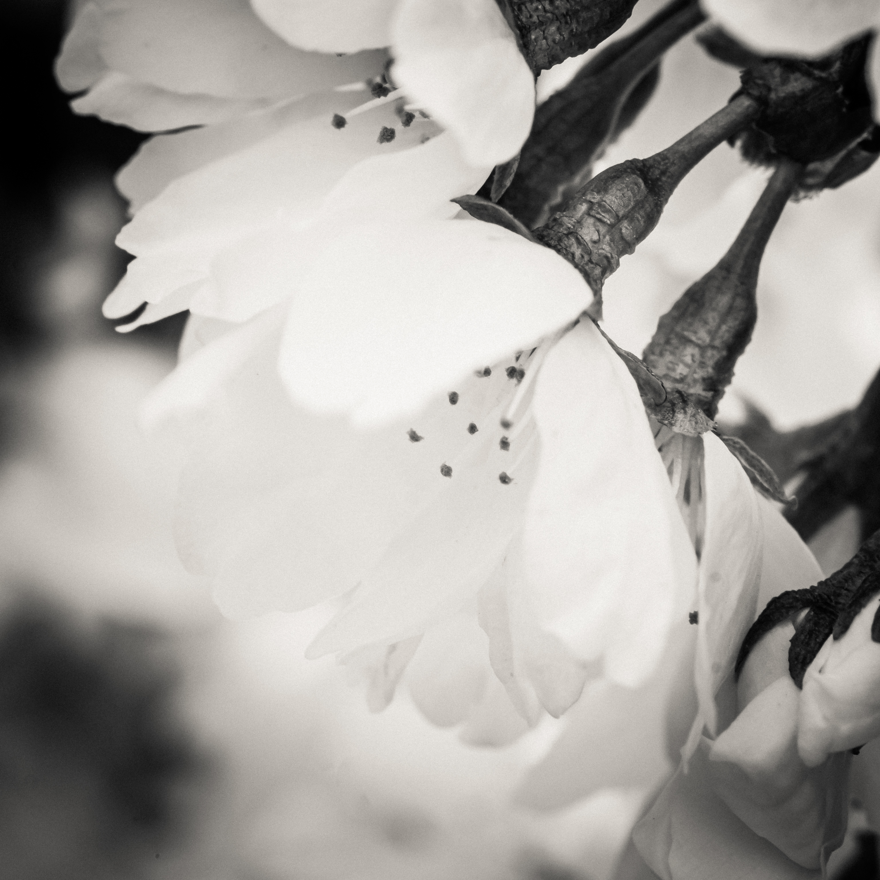 The second image, in black and white, focuses not on the flowers but the stems and their texture. I like the contrast between the soft flowers and the rough quality of the stems. It does not feel restful, like the image above. My eyes are drawn to the stems and to the black and white contrast.