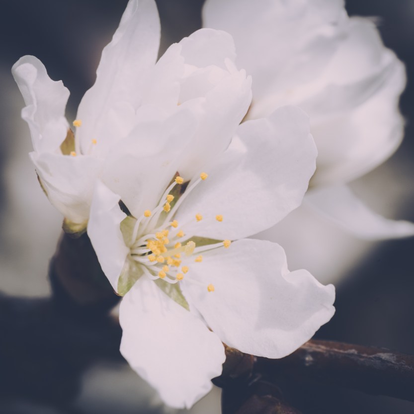 The three images of flowers are from the same tree that the ground hog climbed–variations in processing. The first one has a calm, soft feel to it. Most of the day, yesterday, was cloudy, and this image had that quality.