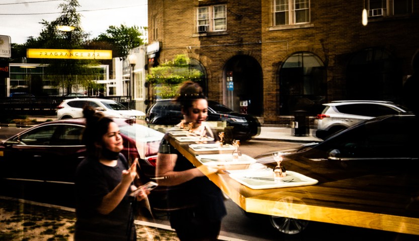 This is one of my favorites from the day. The two people have their phones out, but they were actually talking, not just walking beside each other. And the reflections in the restaurant window work well. Is the “Fragrance Bar” in the restaurant or across the street?