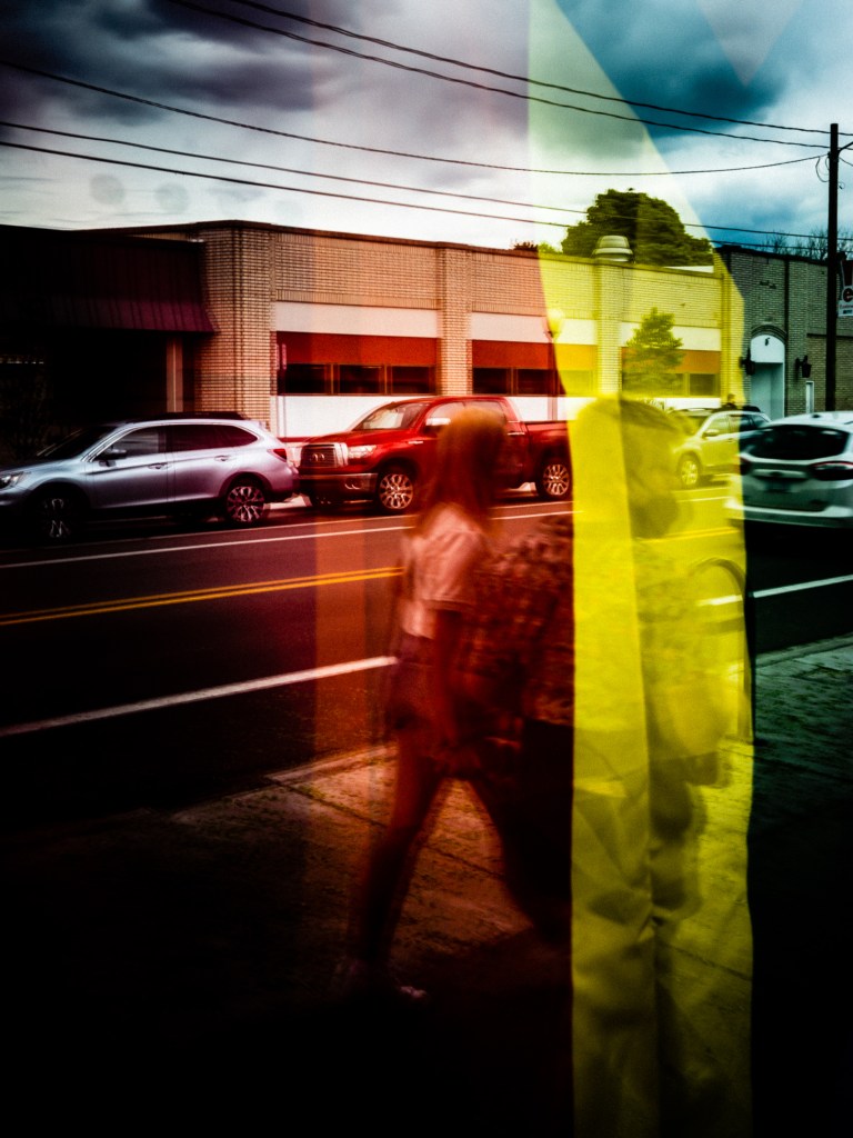 There were few people walking when I saw a window with a Gay Pride flag in it. I thought that the colors and reflections might have an interesting effect. But the reflected scene was not by itself very interesting. And I had to wait a bit for someone to walk through the scene that I’d framed up. But the image worked pretty well.