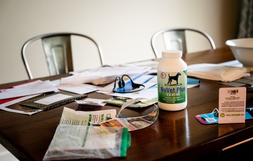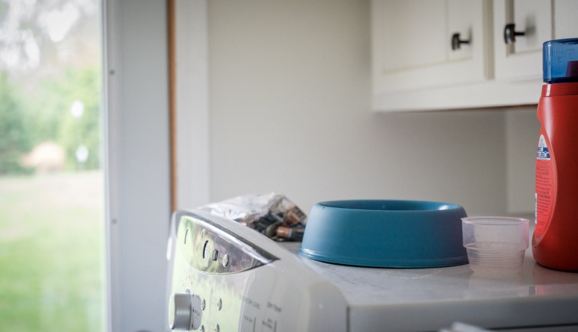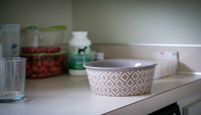 Signs of a dog in the house include a hanging set of shelves in a closet with many of his toys and accoutrements, a flashlight, leash or two, collar, harness, treats, etc., on the beer freezer by the back door, the current primary entrance and exit for his walks and potty breaks. Food and water bowls, and so much more.
