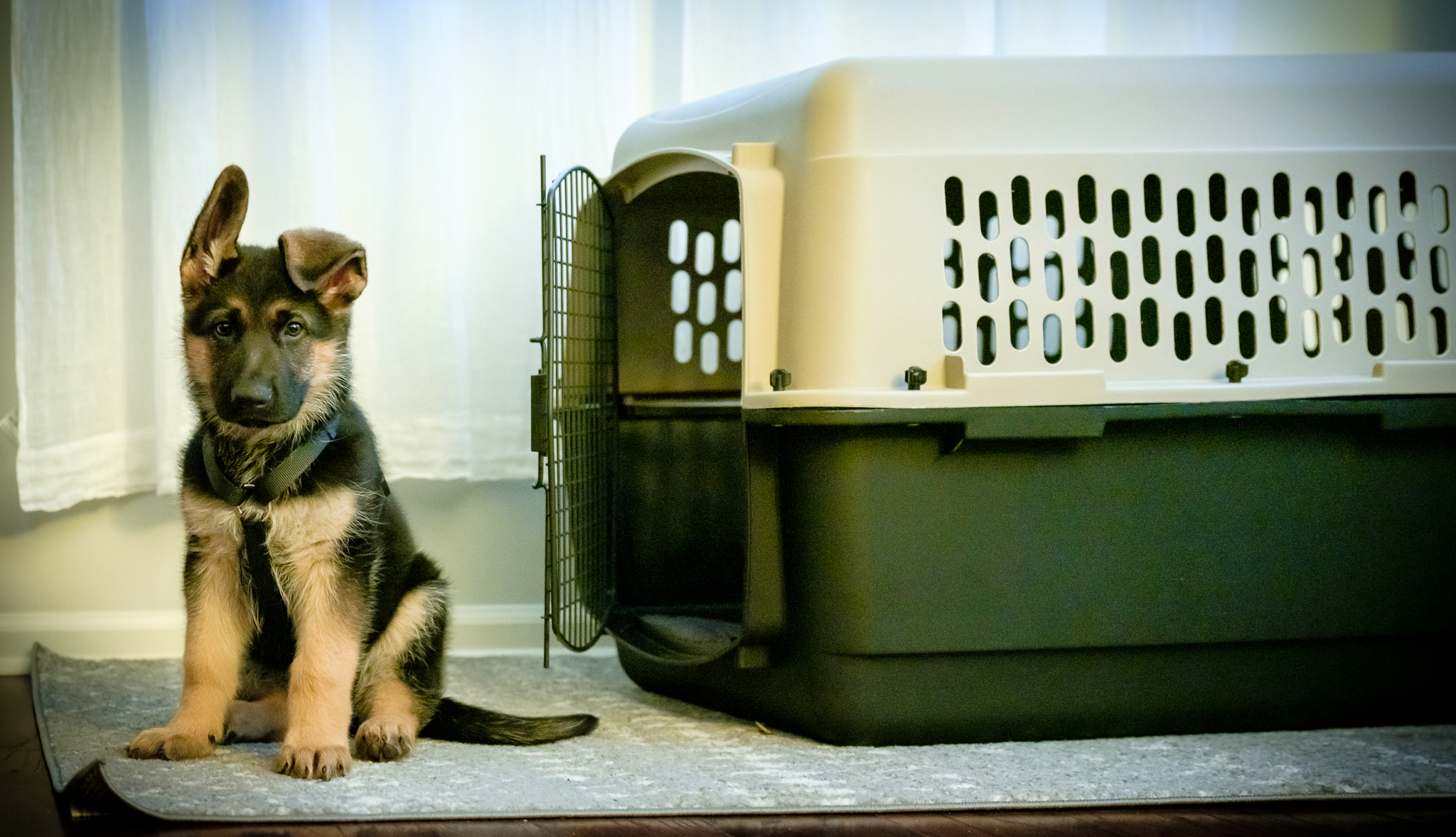 And crate training. Oh, there’s crate training. For sleep overnight and crating for a hour or two at this point during the day, when no one can watch him (errands, showers, cooking, going for a run, a brief trip groceries, cleaning up). Our previous dog, Jonah, took to the crate right away. Happily. No more than a bit of whining the first night. Then all good. A trooper. Wallie? Not so much. After some long bouts of angry crying the first night or two, he now is pretty content at night. Daytime? Not so much. We’re trying a “good cop” approach. Here’s Wallie and his nemesis.
