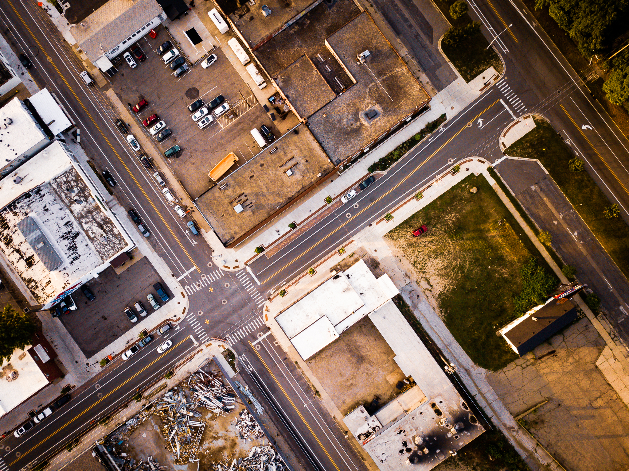 Finally, two random images. The first is the setting sun. The evening sun and approaching sunset is what drew me to the Belknap Lookout. The first image is a mix of pretty light and moody shadows. The last image of the blog post is looking straight down, picking out some lines and shapes from the streets and buildings. I thought about going black and white, but in the end kept the same contrasty color palette as the other images.