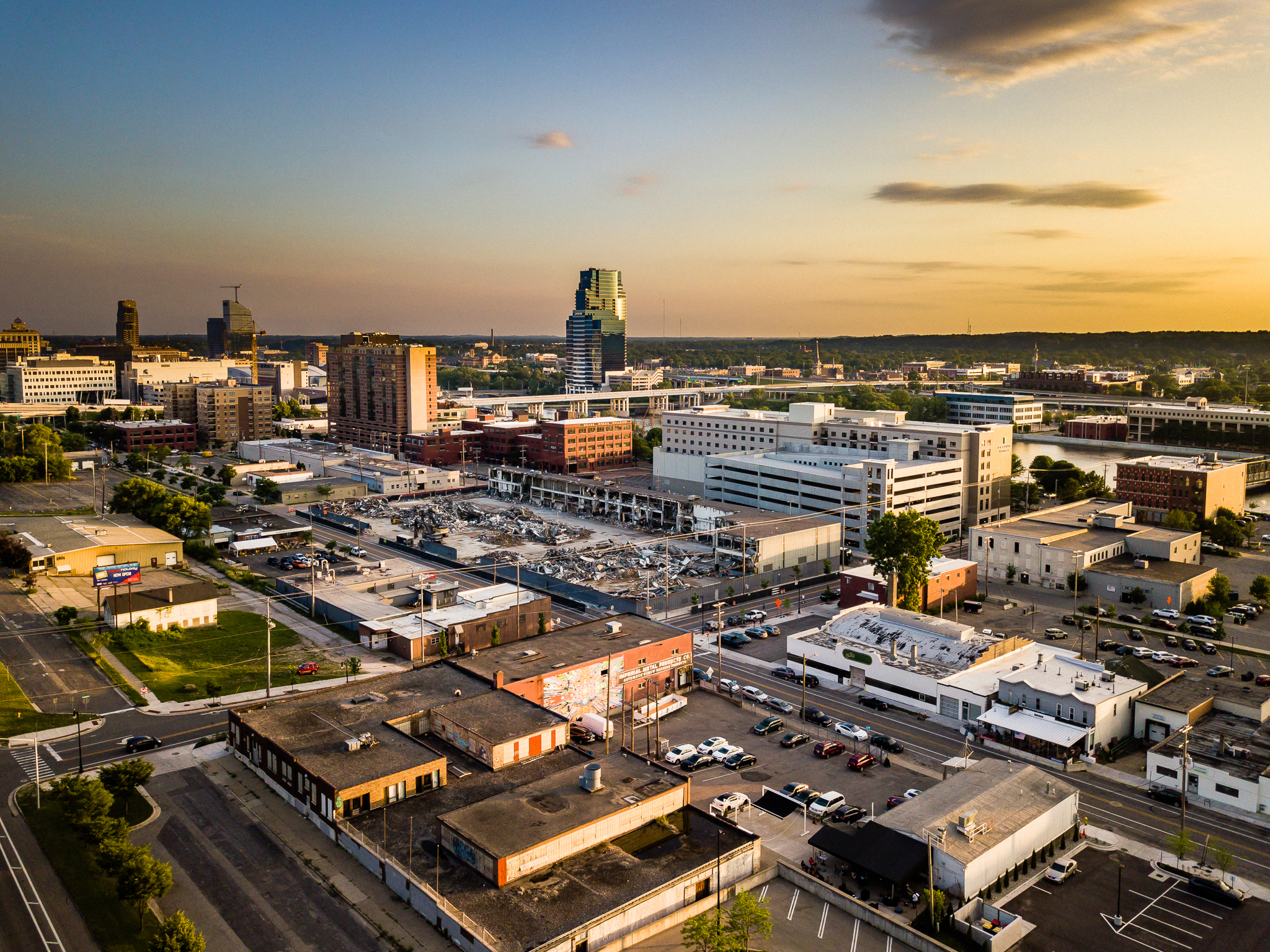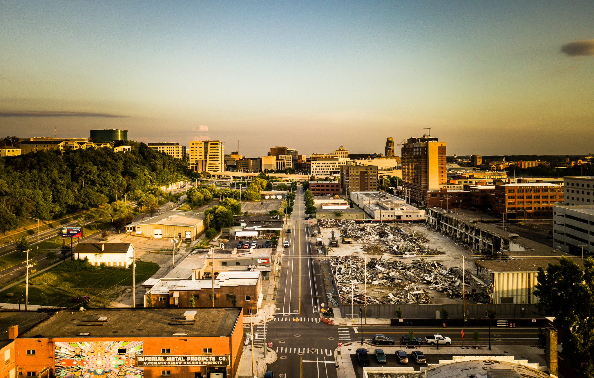 The area north of downtown, along the river, is an interesting mix of condo and apartment buildings and small industry and warehouses. A bit of retail and some restaurants too. The next two images give you a long view. I like the second better, I think, for how it shows off the freeway. The mural on the first one, on the bottom left, drew my eye in making that image.