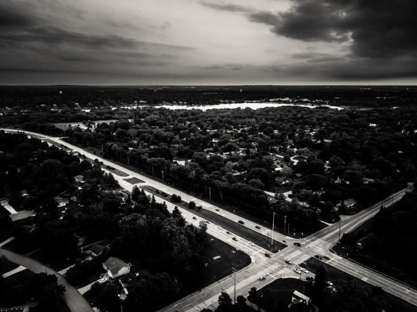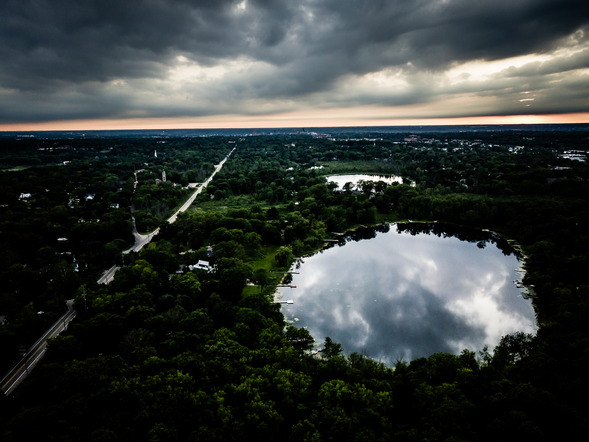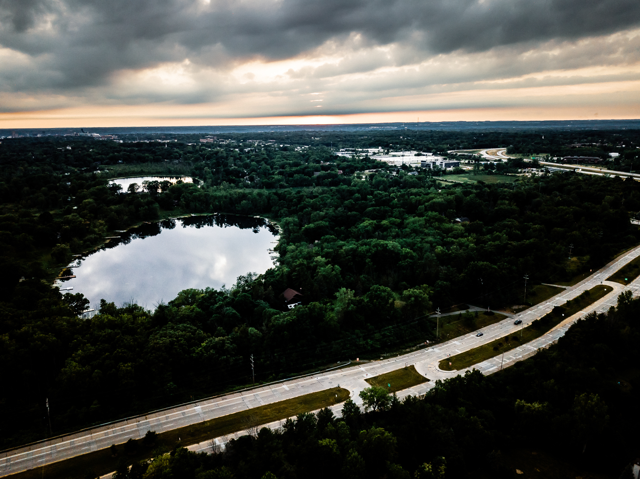 This weekend I did a couple of updates on my Mavic Pro drone and then took it out for a test flight. I decided to take off from Manhattan Park in East Grand Rapids, near sunset. I found some spots to hover over with interesting views and captured a few images of roads, where leading lines were the key feature, and a few with a little lake that had reflections of the cloudy sky.