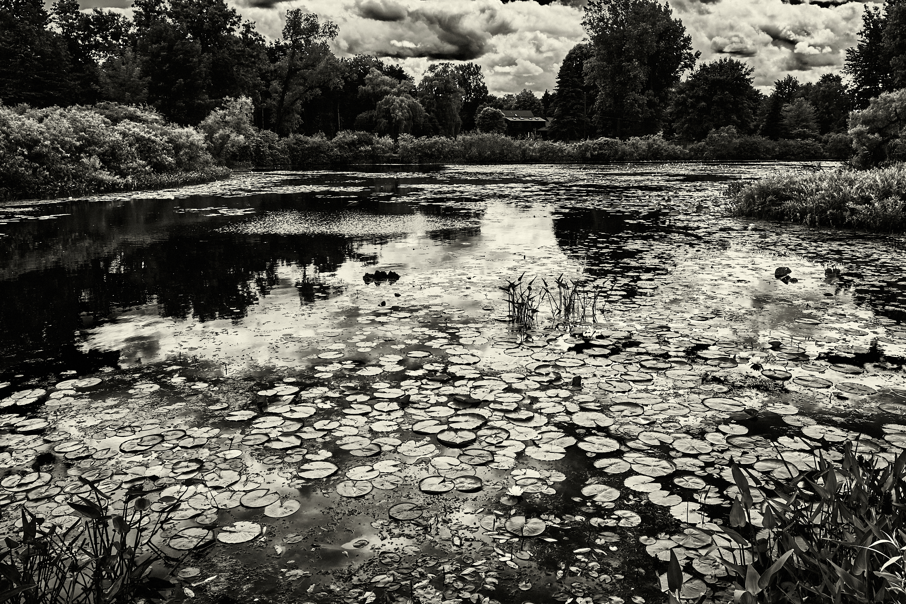 I went black and white because the colors were almost entirely green, with a bit of blue in the water and sky. They were distracting and did nothing to show off the shapes and lines in the image. In processing the image, I added some contrast, but mostly I worked to control the super bright spots and the really dark spots.