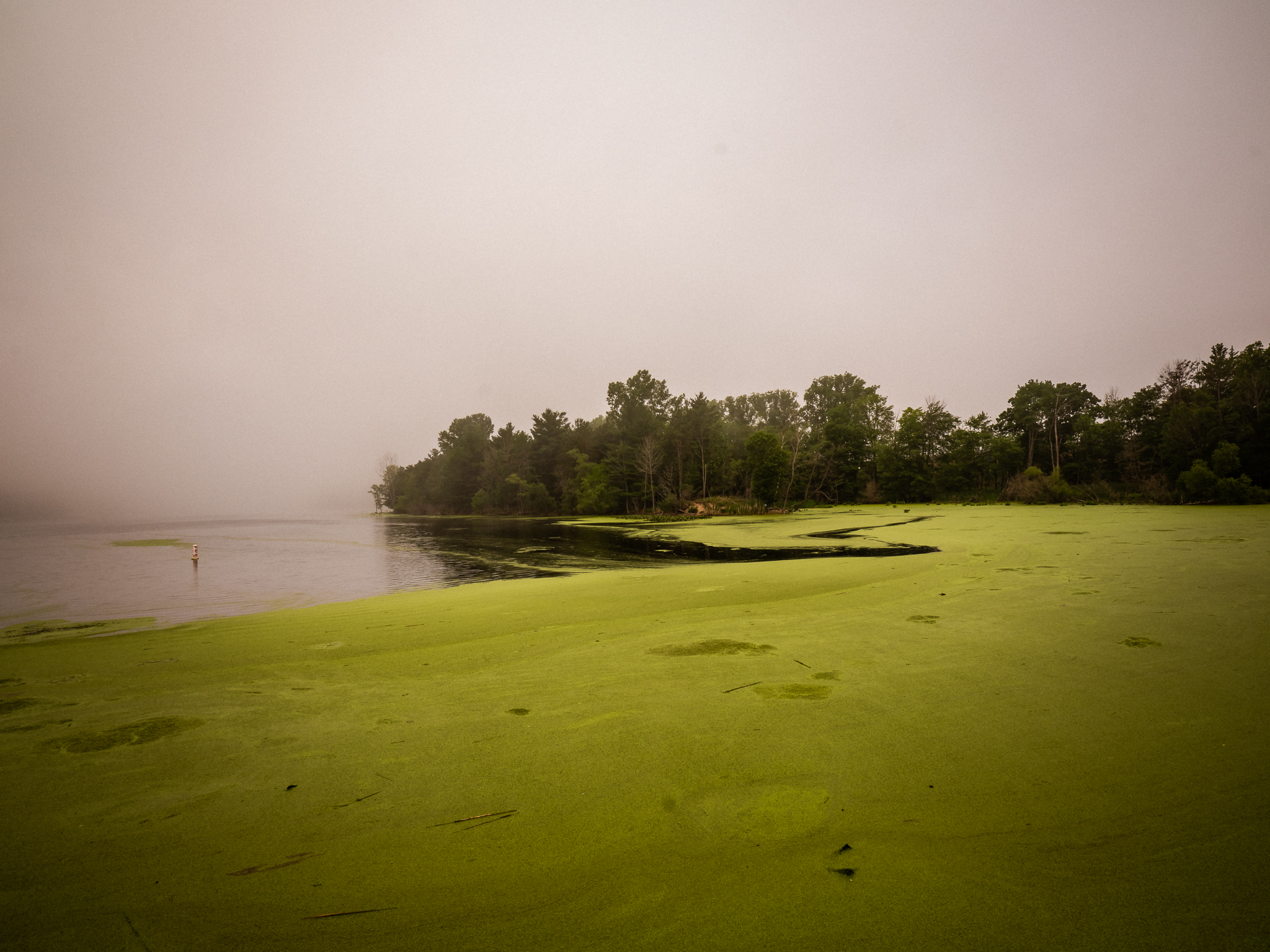 The algae bloom in Pigeon Lake is stunning, presumably a result of fertilizer from all the nearby farms and perhaps warming water temperatures. There’s a eerie beauty to the green-yellow color, sort of, but mostly it makes the water look sick. The fog added to the atmosphere.