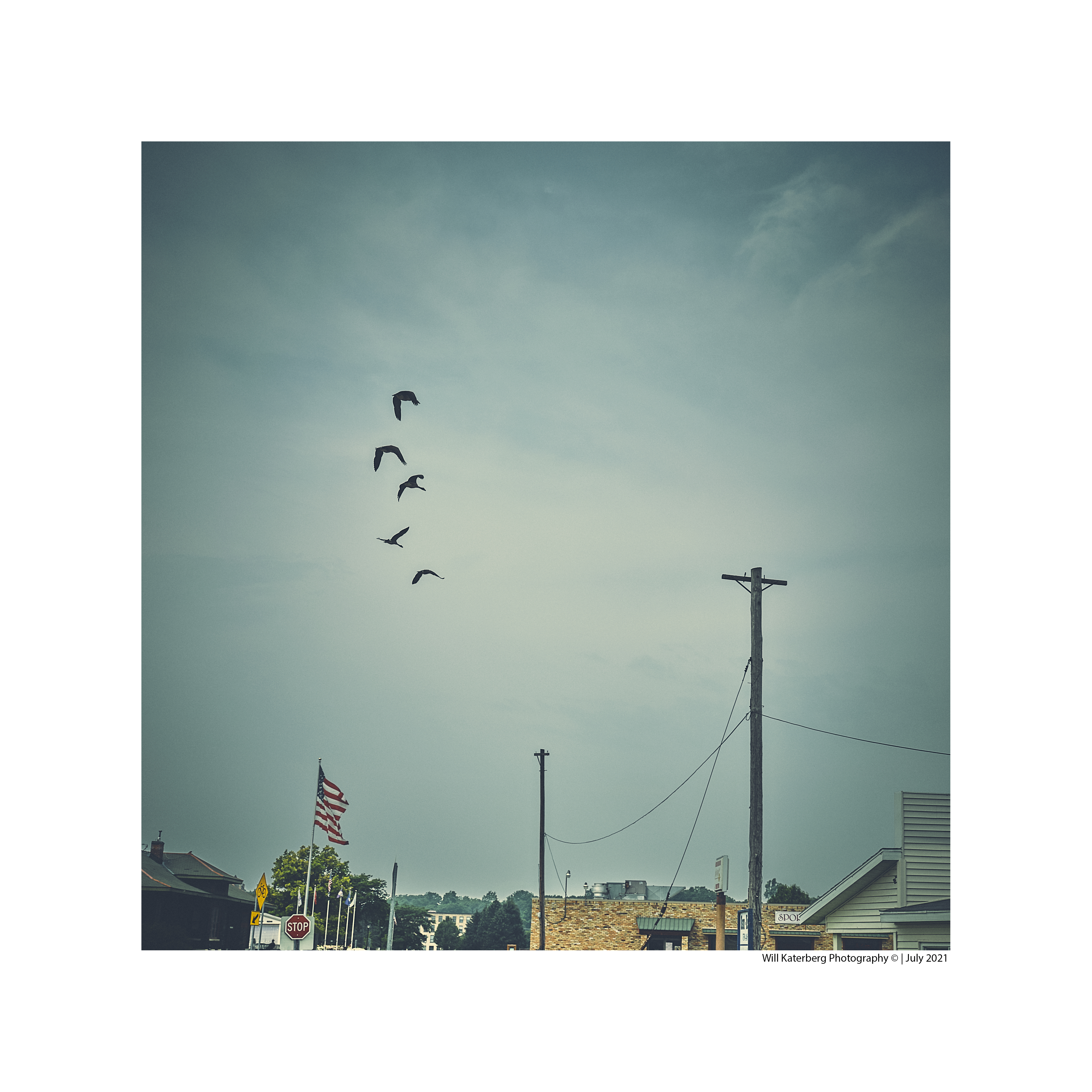 The last two images are standalone, from the historic downtown area. The first is the historic main library, now with a historical society facility added to it. It’s a lovely old building with a neo-classical feel to it. The style feels discordant in the town today. It may have fit better before the historic downtown was torn down. The second image is some birds flying near the Flat River near the VFW. I took them by chance on a whim. But they capture something of my mood and the place.