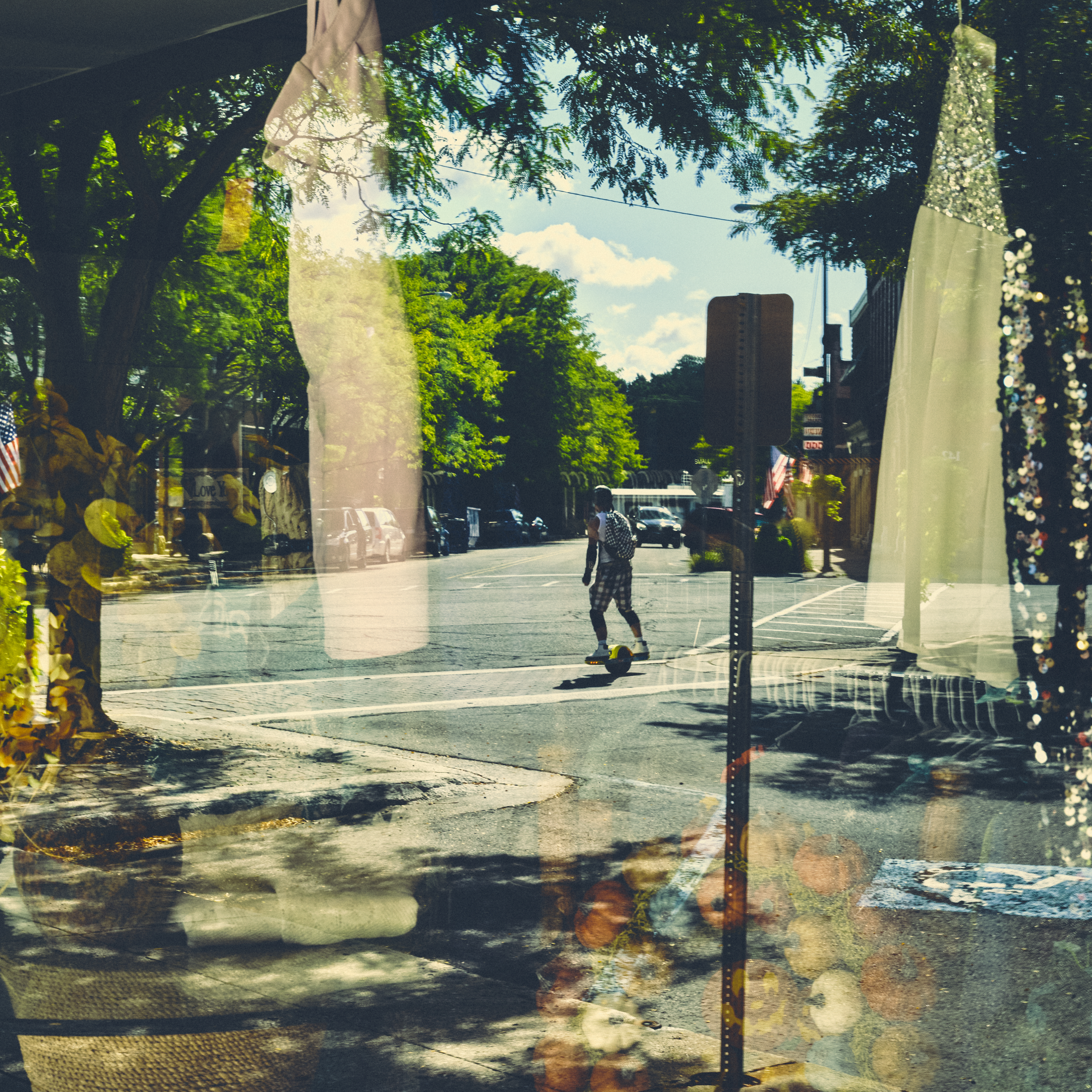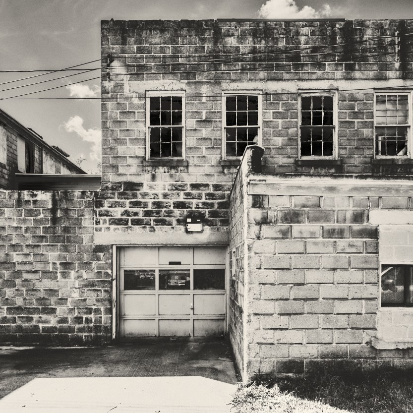 The last three images are a grab bag. With the first one, I was framing the reflection, thinking it was not all that interesting, when the guy on the electric skateboard motored through the scene. The fading paint on the second caught my eye. And the lines and rectangles drew my attention in the third. In that one I went black and white because the colors were boring and seemed a distraction.