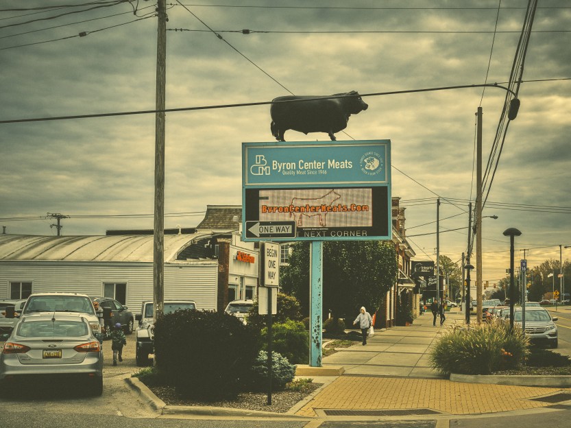 My favorite place in the business district, despite it not feeling historic, is Bryon Center Meats, with the beefy statue atop its sign. It stands out in a delightful way.