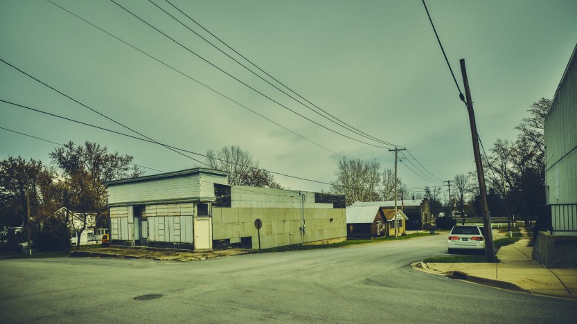 A couple of buildings caught my eye for their quirks. The first two images are of a business, an auto repair shop, with an image of John Wayne helping to keep the riff-raff away. There’s a “no soliciting” sign in front of Wayne, at belt level. The third image looks to be a vacant building.