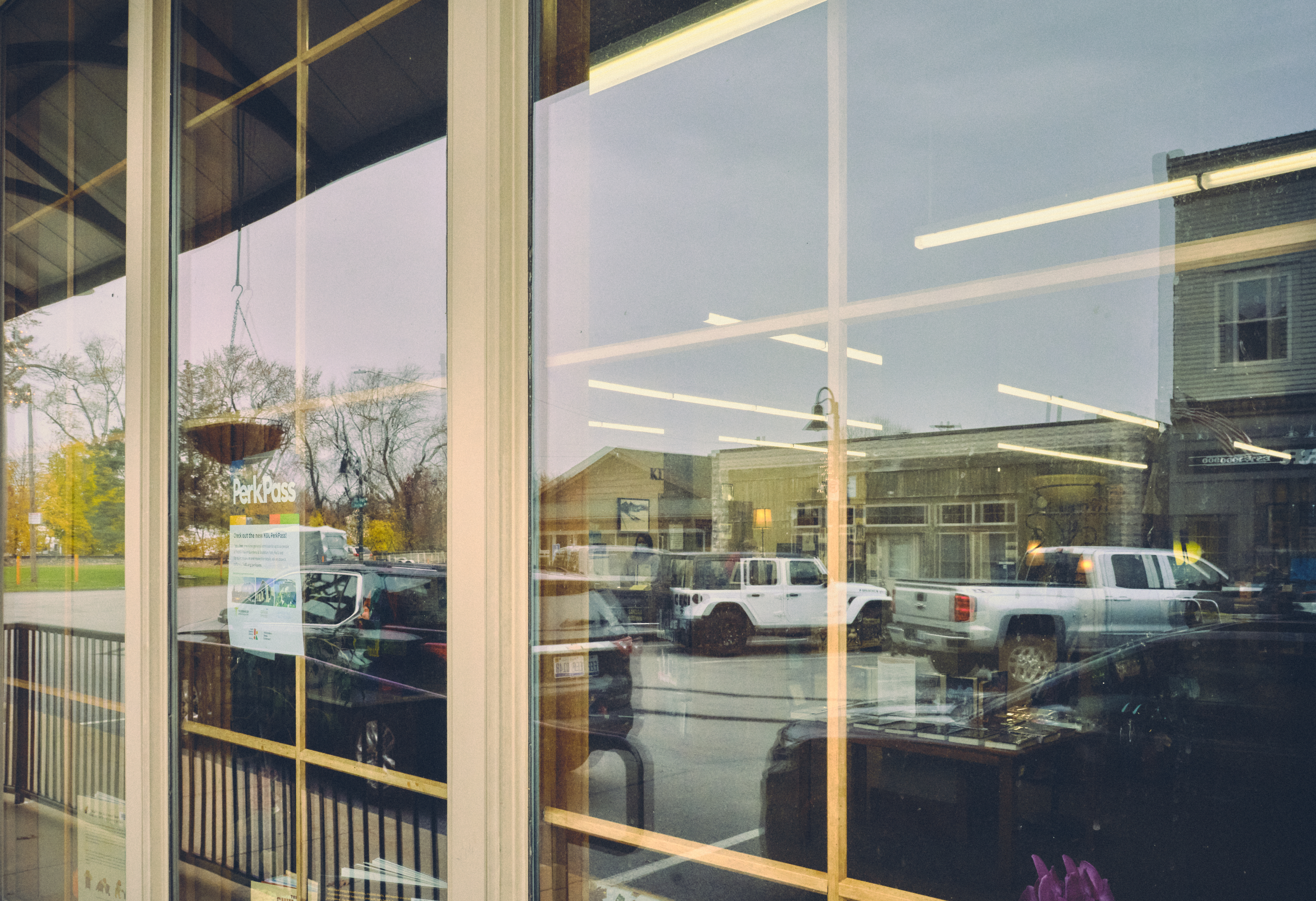 The library was a bright spot. When I glanced at it, I thought it was a large book store for a small town, but then realized it was a branch of the Kent District public library. The first two pictures are of the library. Across the street, as you can see in the reflection in the second image and in the third image, was a tavern busy with the lunch crowd.