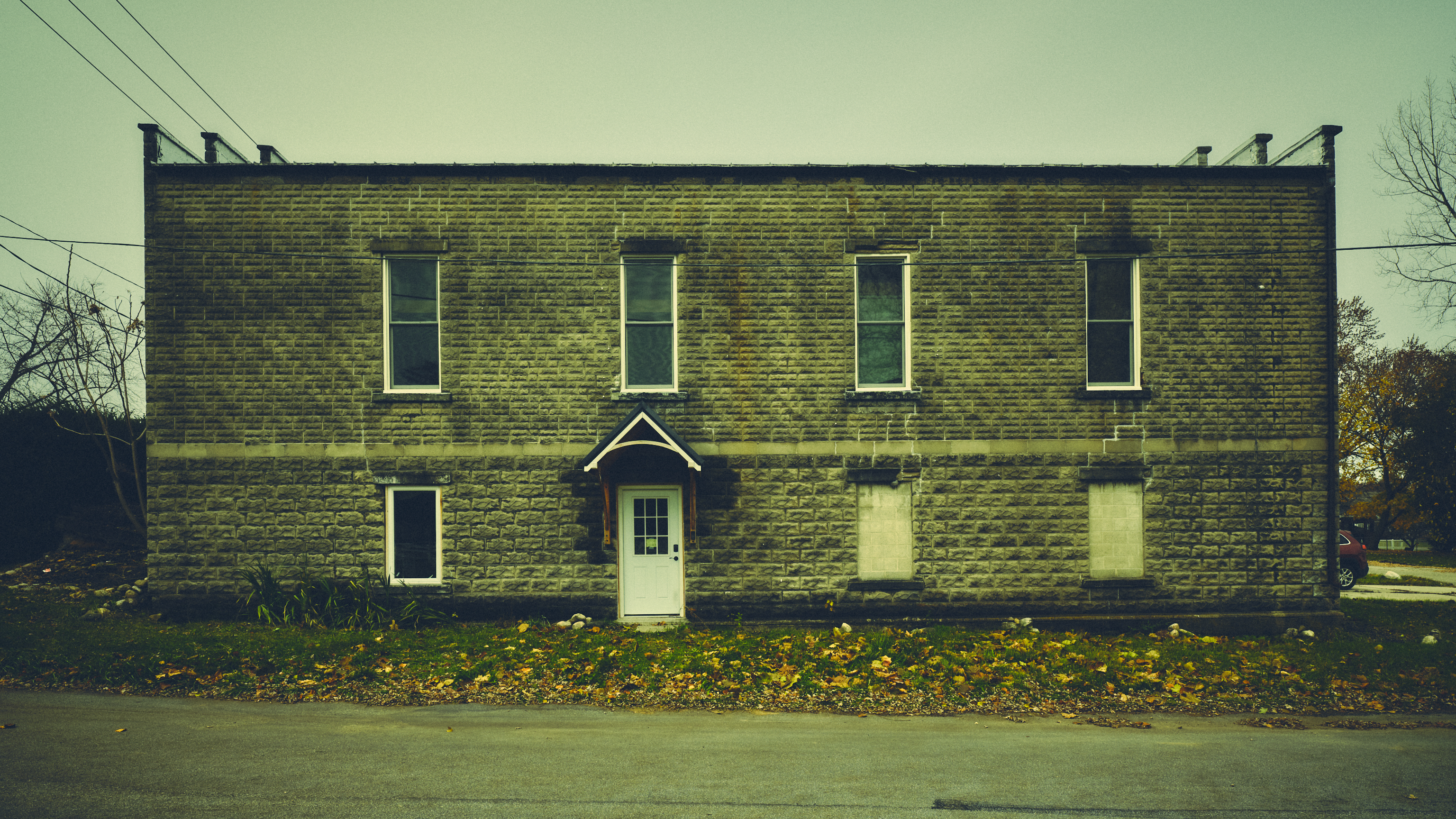 A couple of buildings caught my eye for their quirks. The first two images are of a business, an auto repair shop, with an image of John Wayne helping to keep the riff-raff away. There’s a “no soliciting” sign in front of Wayne, at belt level. The third image looks to be a vacant building.