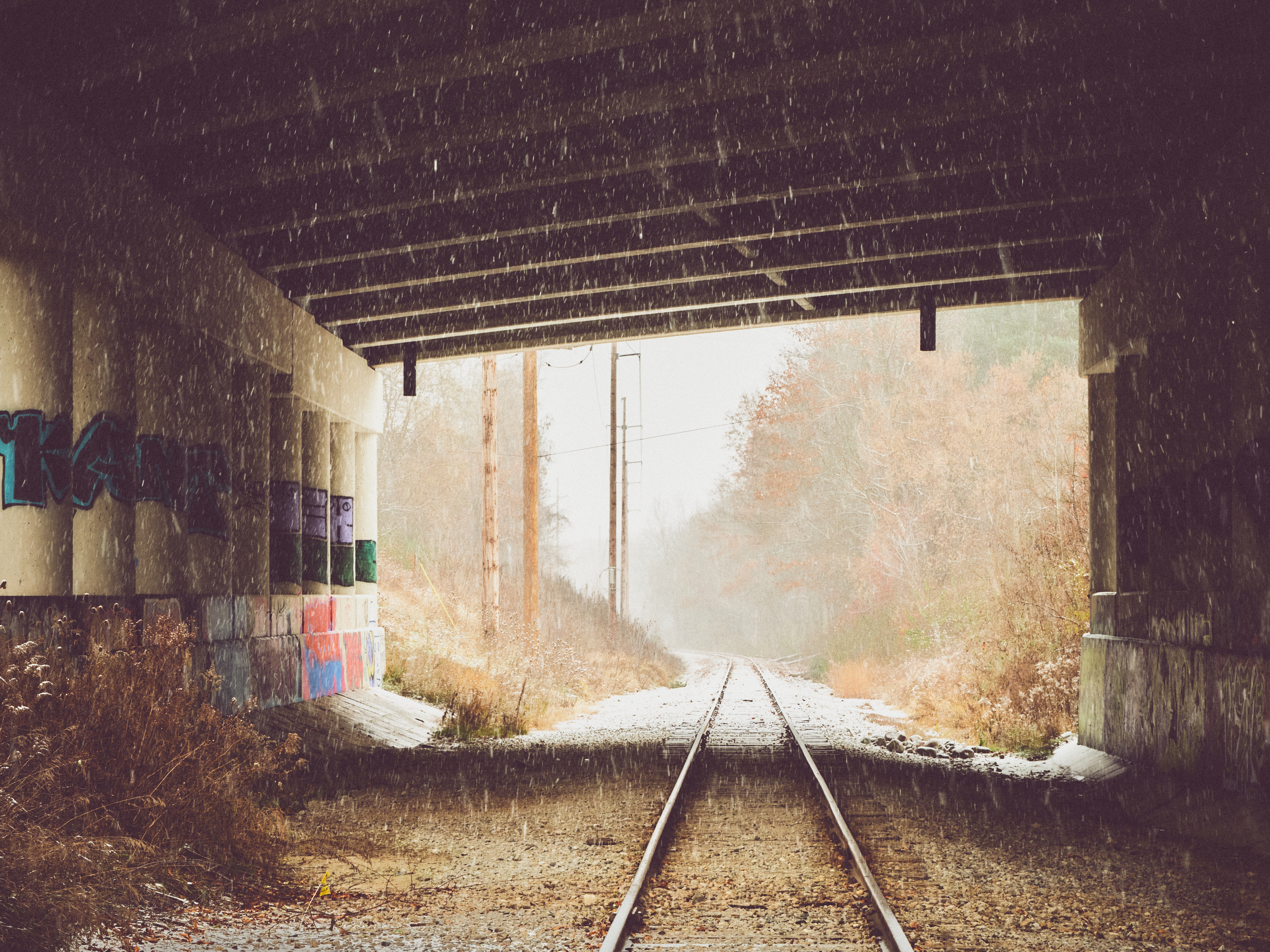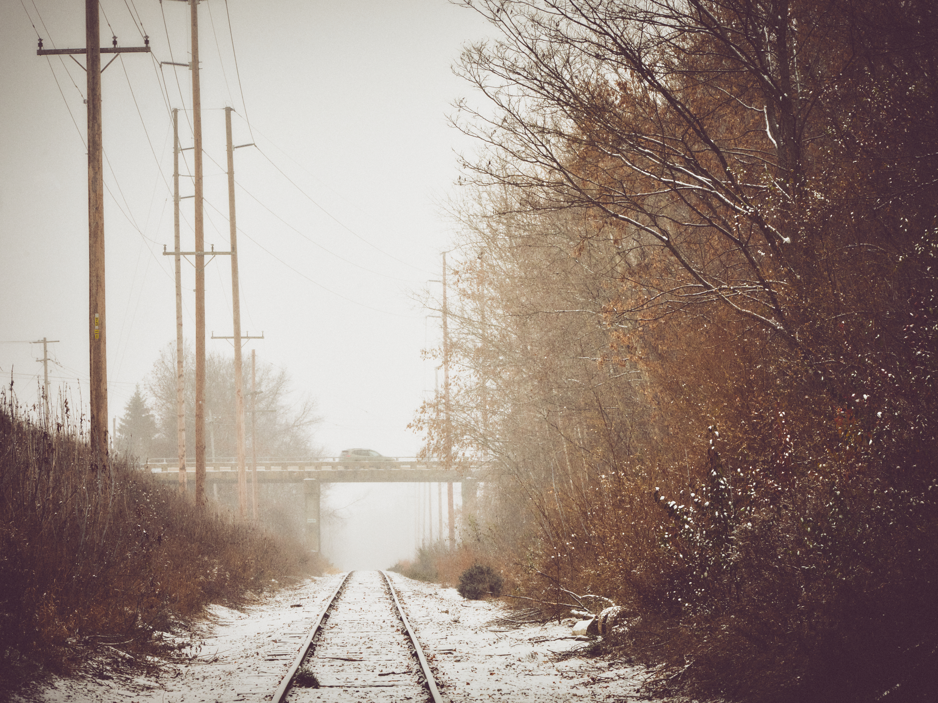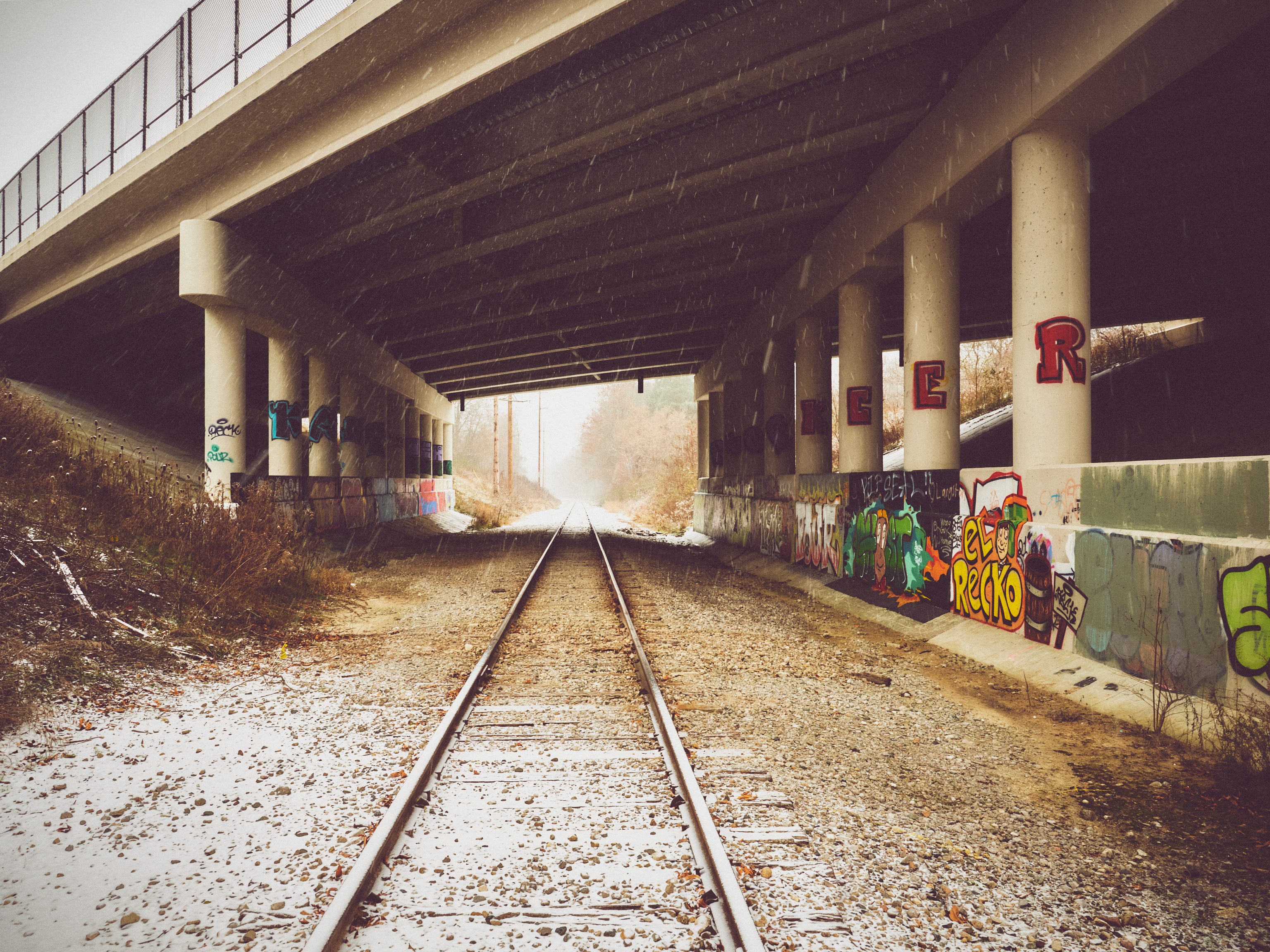 This week’s images are of a bridge–well, two bridges–and some railroad tracks between Grand Rapids and Ada village. I was attracted by the colors in the graffiti, the lines in the tracks, bridges, and utility poles and lines, and the new snow.