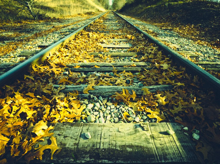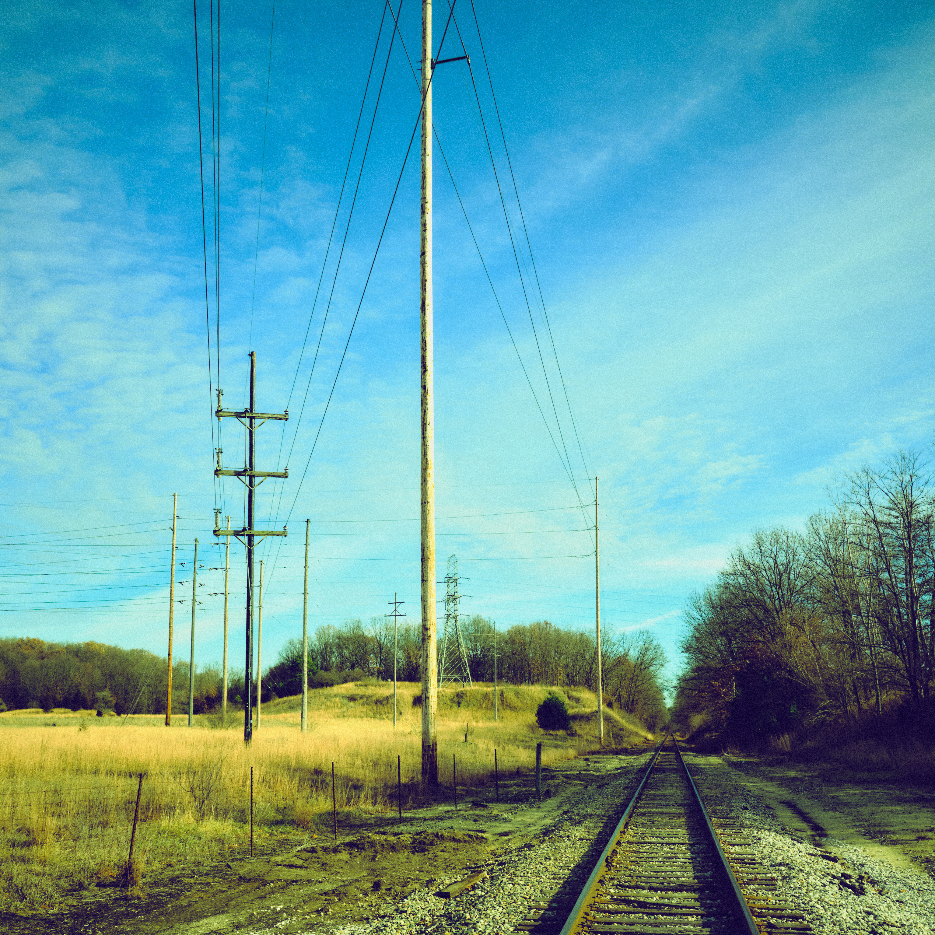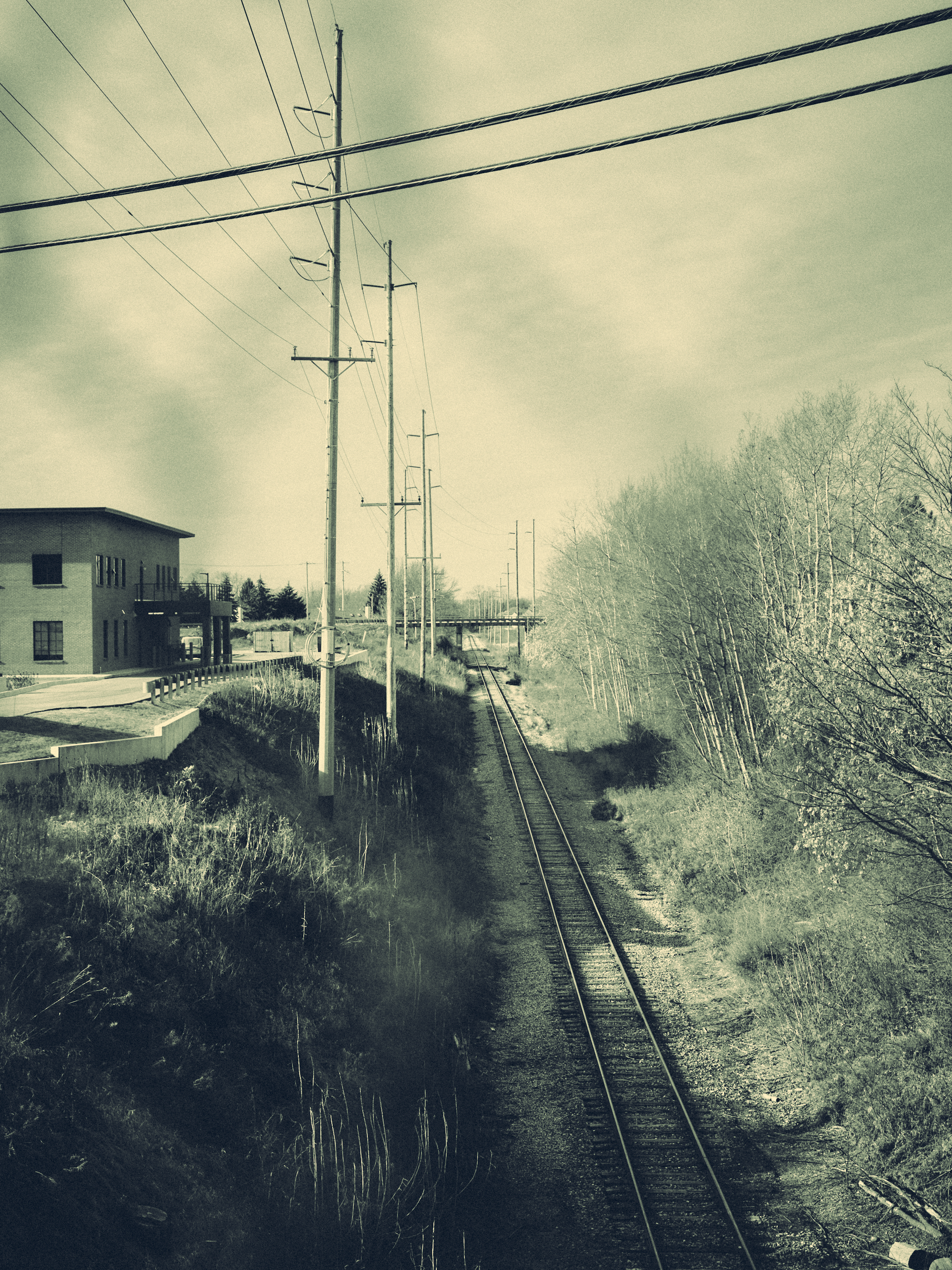 First the “warm” images. I saw the warm, yellow-orange-green-blues as I drove by a railroad track and electrical utility station, so I stopped to photograph. I took one more set of photos as I returned home, at the same bridge and railroad track I photographed a couple of weeks ago. But this time I took some photos from atop the bridge. Here are monochrome and color versions of a few of the images.