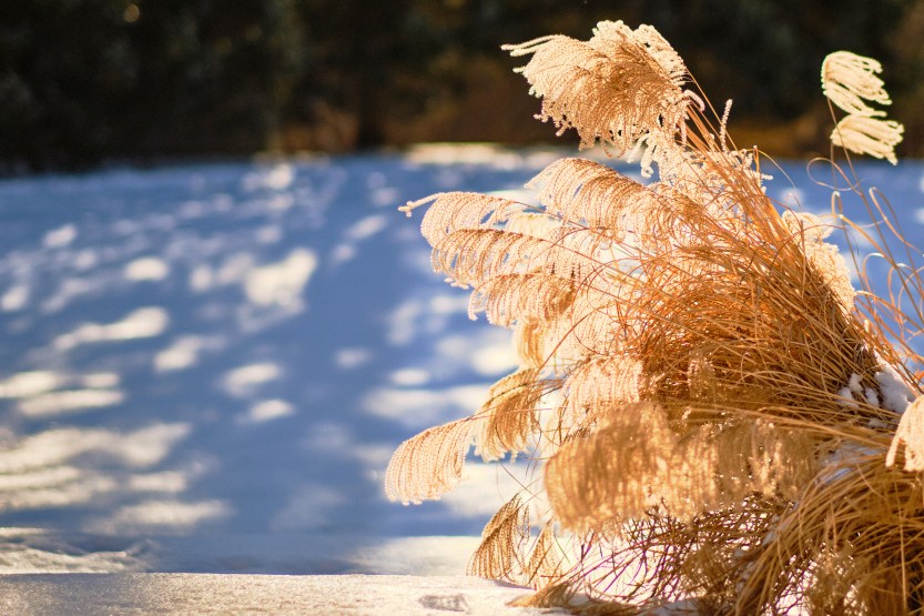 While puttering around the kitchen and living room, I kept noticing the warm, almost swampy-colored light, hazy and warm looking on the snow, light that in the summer would come with humid air and be glimpsed, dappled, in a forest of weeds, and shrubs, and trees. But this light washed over the snow and tall grasses in parts of my yard my backyard and was dappled with shadows in other parts. I’m not sure that makes sense, but it’s what the light seemed like to my eye.