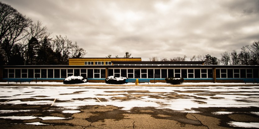 The yellow, blue, and white in the trim and window frames of the school drew my eye. I also liked the geometric shapes in the architecture in contrast to the random shapes in the snow and asphalt of the parking lot.