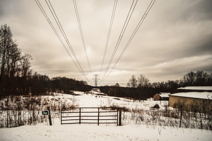 I was trying to capture the light, which was somehow both gray and painfully bright unless I wore my sunglasses. The “somehow” is, I assume the snow reflecting what light there was. The triangles of power lines and snow nicely draw in the eye.
