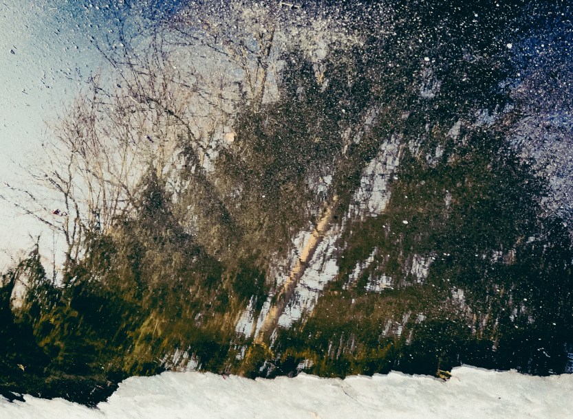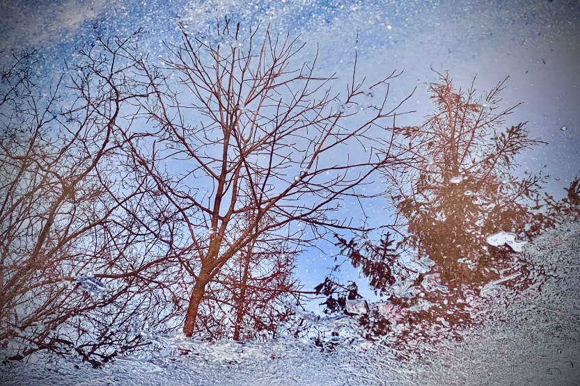 Early in the past week, I got lucky on walks and found a lot of puddles of water, with ice and snow nearby, on the road. I was able to get a series of really fun images with reflections of trees, shrubs, and landscape. Here’s the ones I thought worked best.