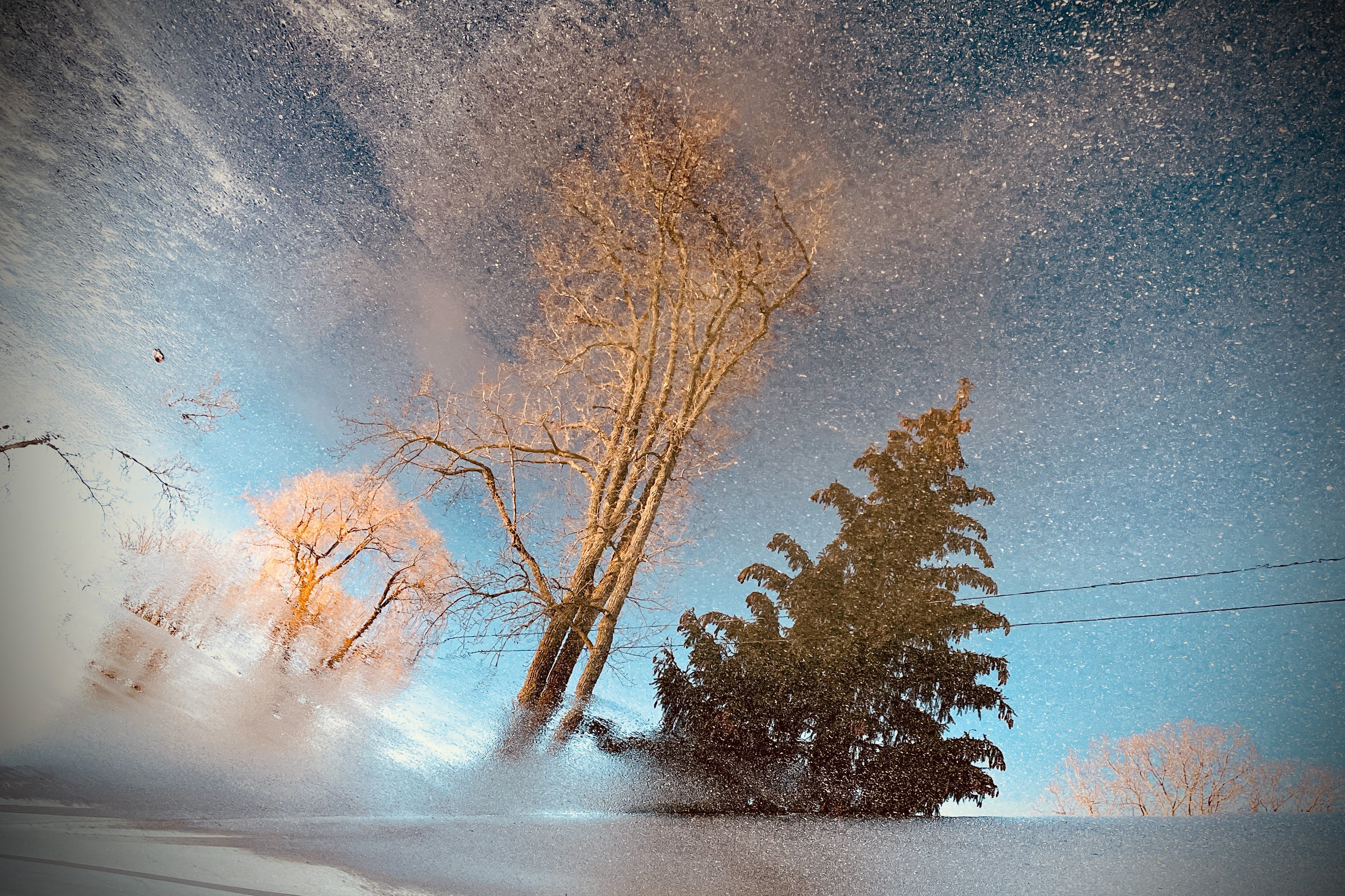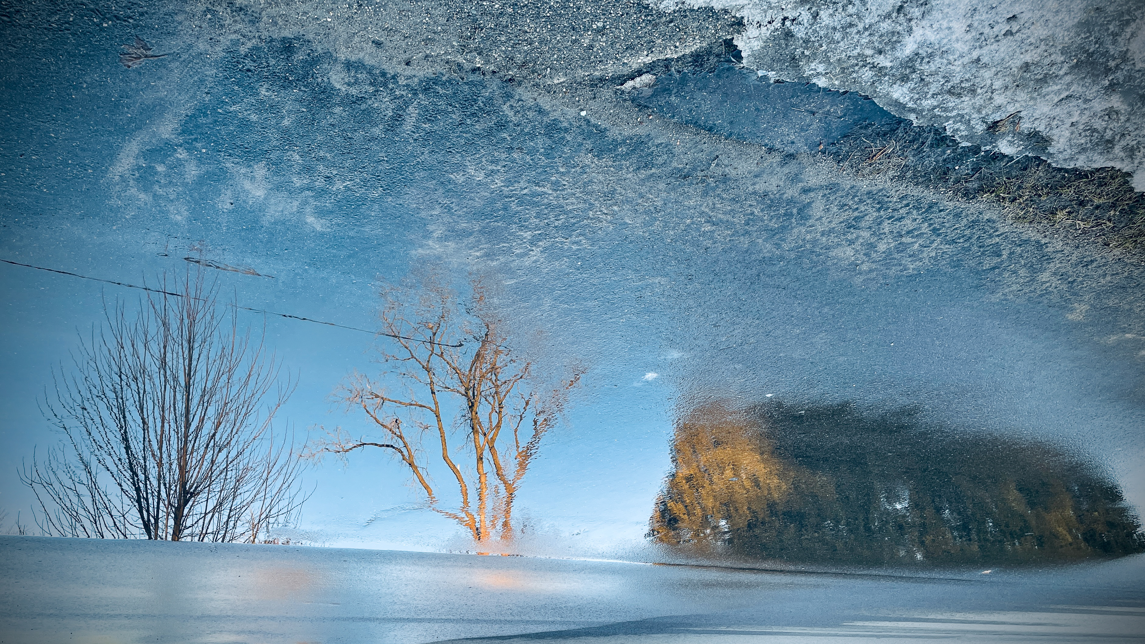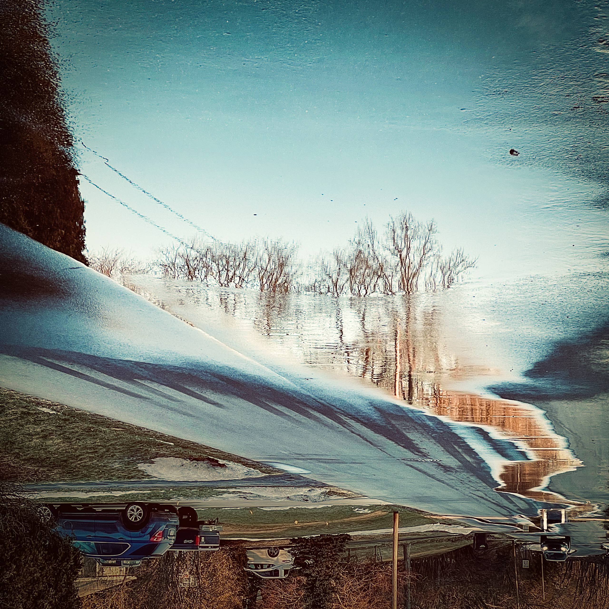 Early in the past week, I got lucky on walks and found a lot of puddles of water, with ice and snow nearby, on the road. I was able to get a series of really fun images with reflections of trees, shrubs, and landscape. Here’s the ones I thought worked best.