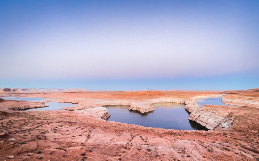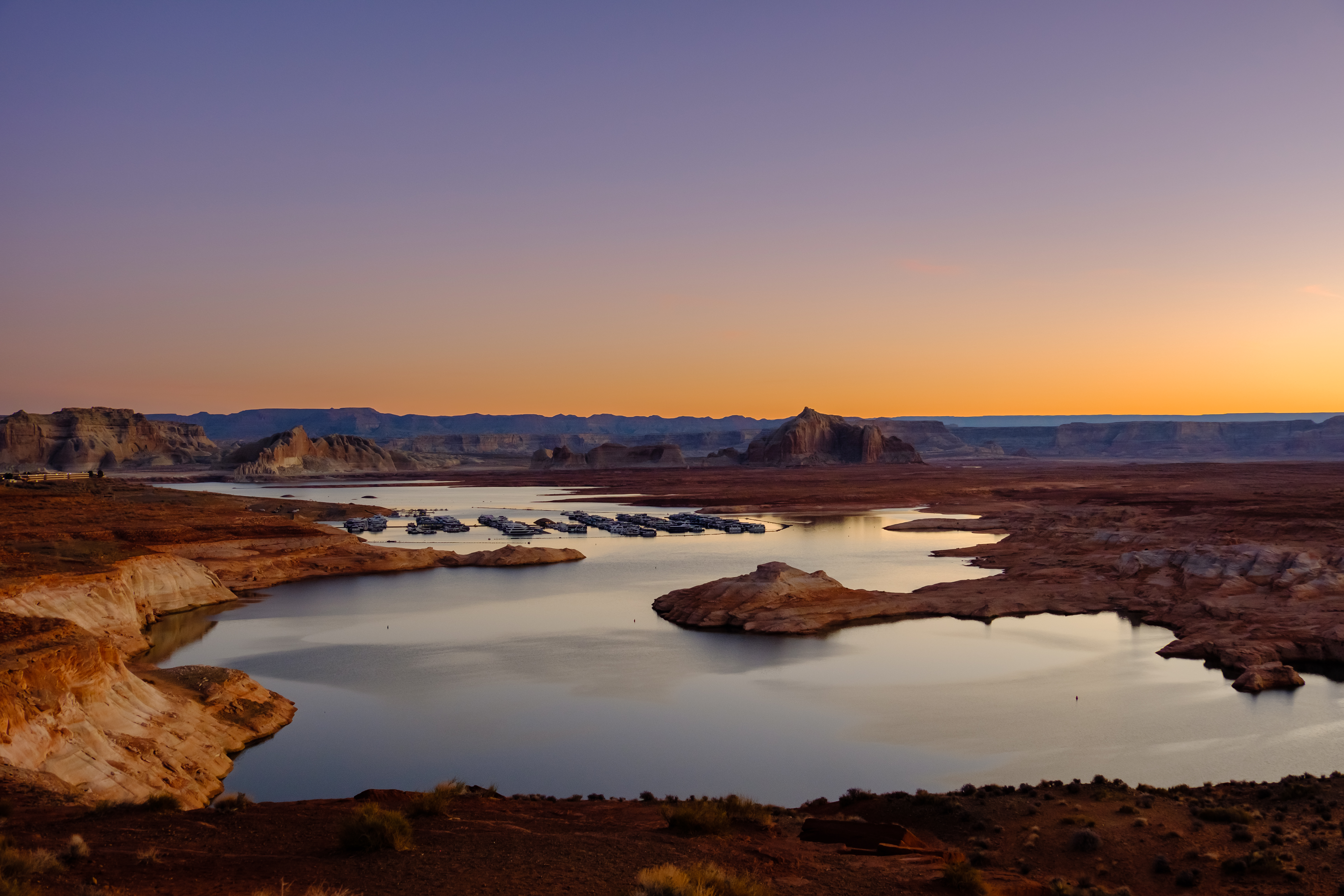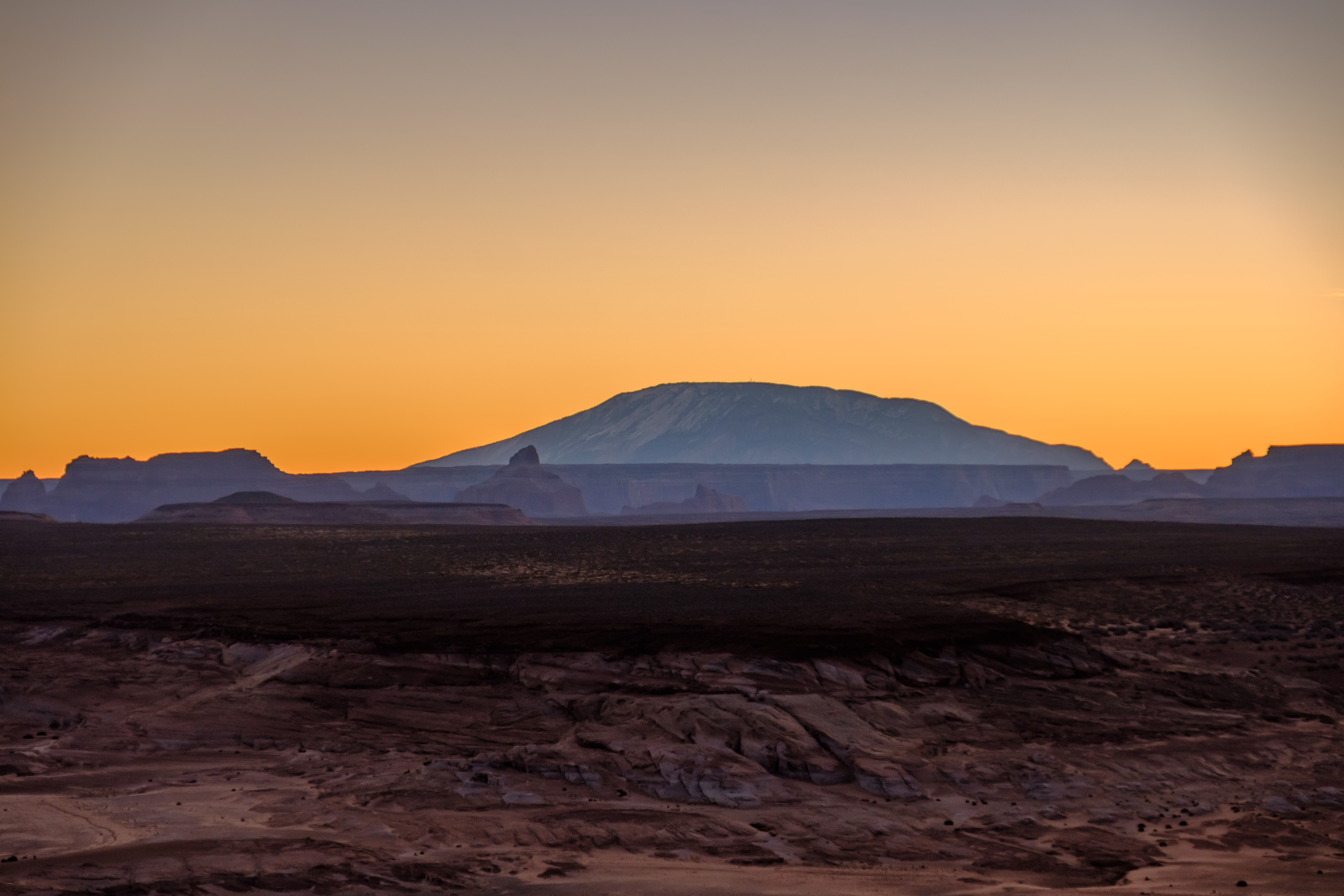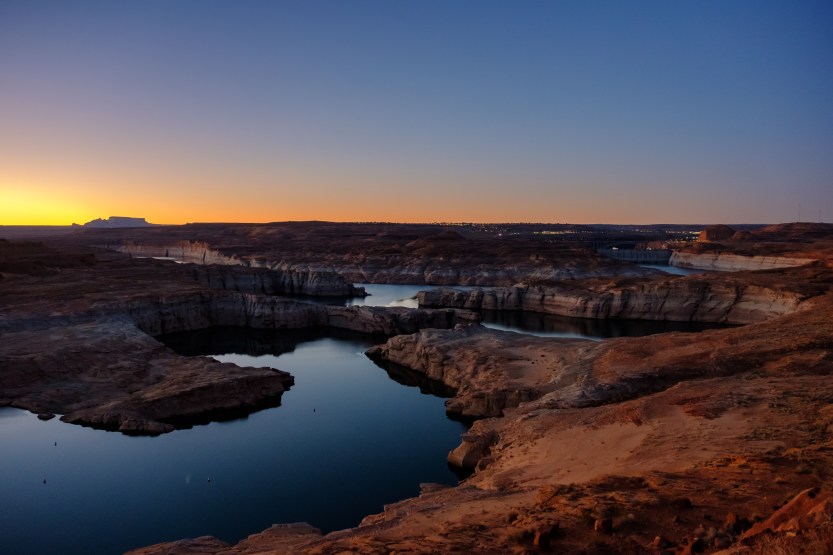 I’m drawn to images of “nature” that reveal human impact. So here are two more. In the first one, taken at dawn, you can see the lights in Page on the upper right. In the second one, at twilight, you can see the pastel colors of the landscape.
