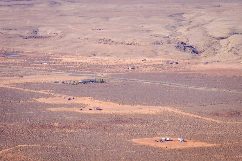 To get to the Bridge and Lees Ferry, you drive south from Page, into the mountains, high enough to get scrub brush and small trees, and then down into a long, desert valley. There are scattered homes, businesses, and small settlements, including churches, as the next image reveals. As you get closer to the bridge, you see more and more stands, where traditional Navajo is sold to tourists. All were closed when we drove through; it was a little hard to tell which perhaps had been abandoned and which would open again later this year once tourist season started in earnest.