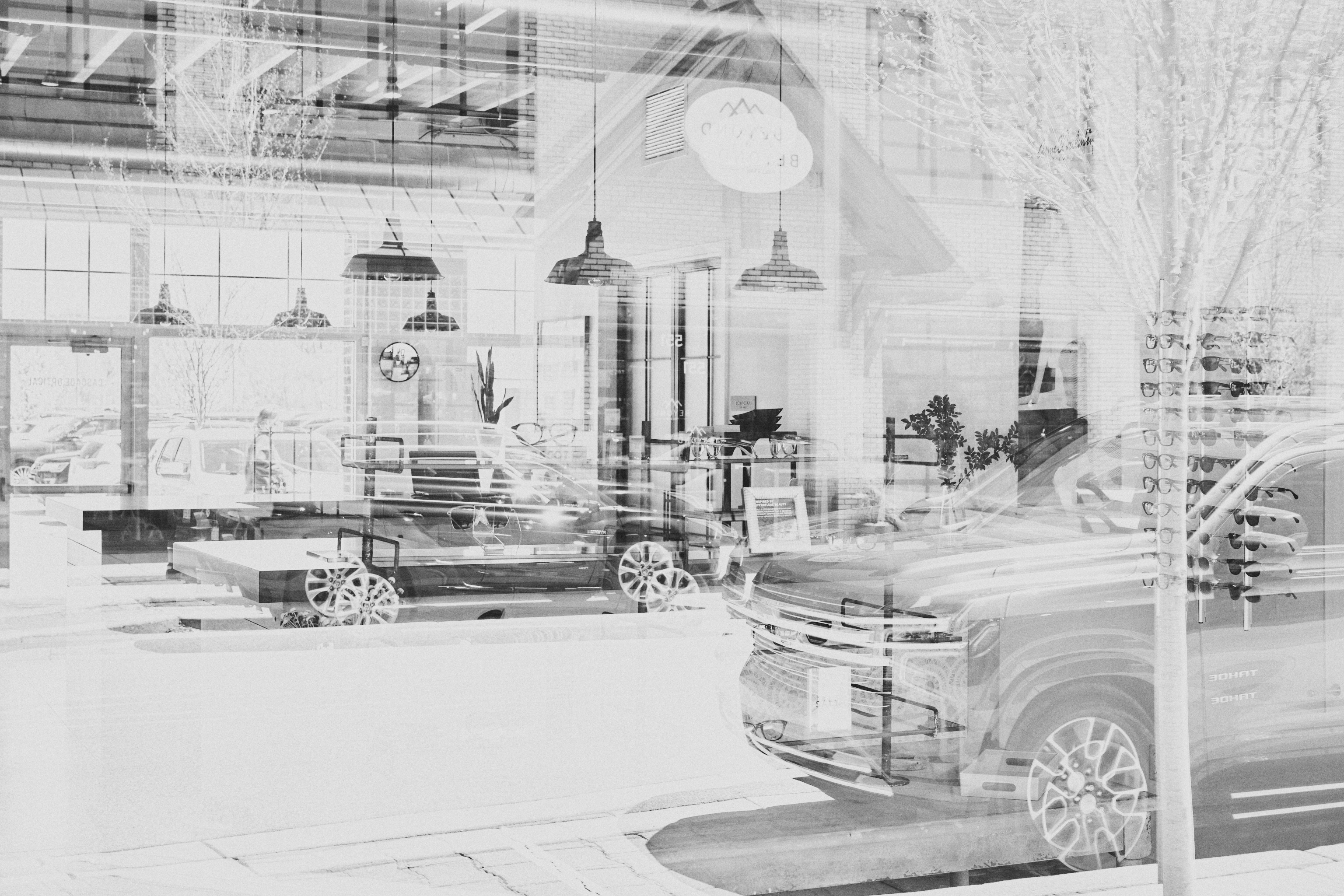The first of this weekend’s images mixes up two layers of cars inside a store, both a parking lot in the back (in terms of where I was) and a cars on the street in the front. In between is the architecture of the building, including external features and interior décor. Does the place sell glasses or cars?