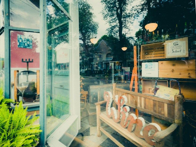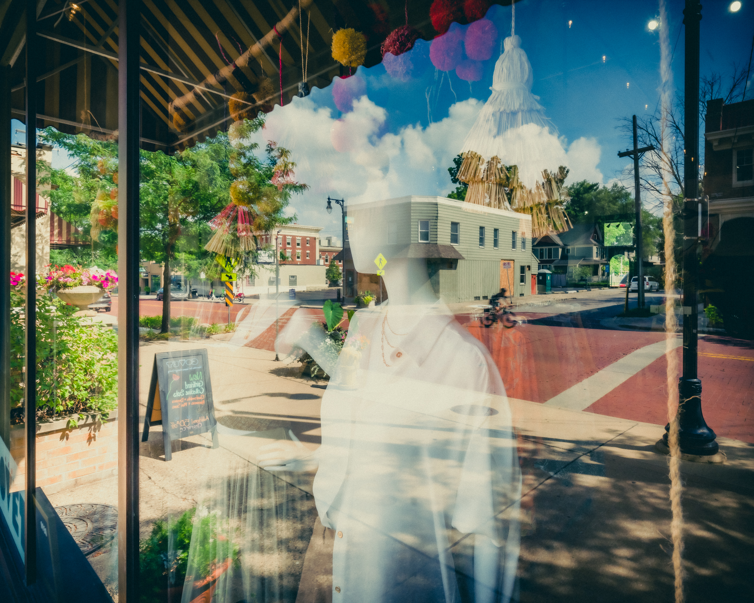 The first two images from Cherry Street are near the corner of Cherry and Diamond, a small business district with a lot of restaurants and pubs. I like the first image for the lines and the cloud. The second image is about the mix of details inside the store window and reflected in it. I waited for some movement, and soon had someone on a bike going through.