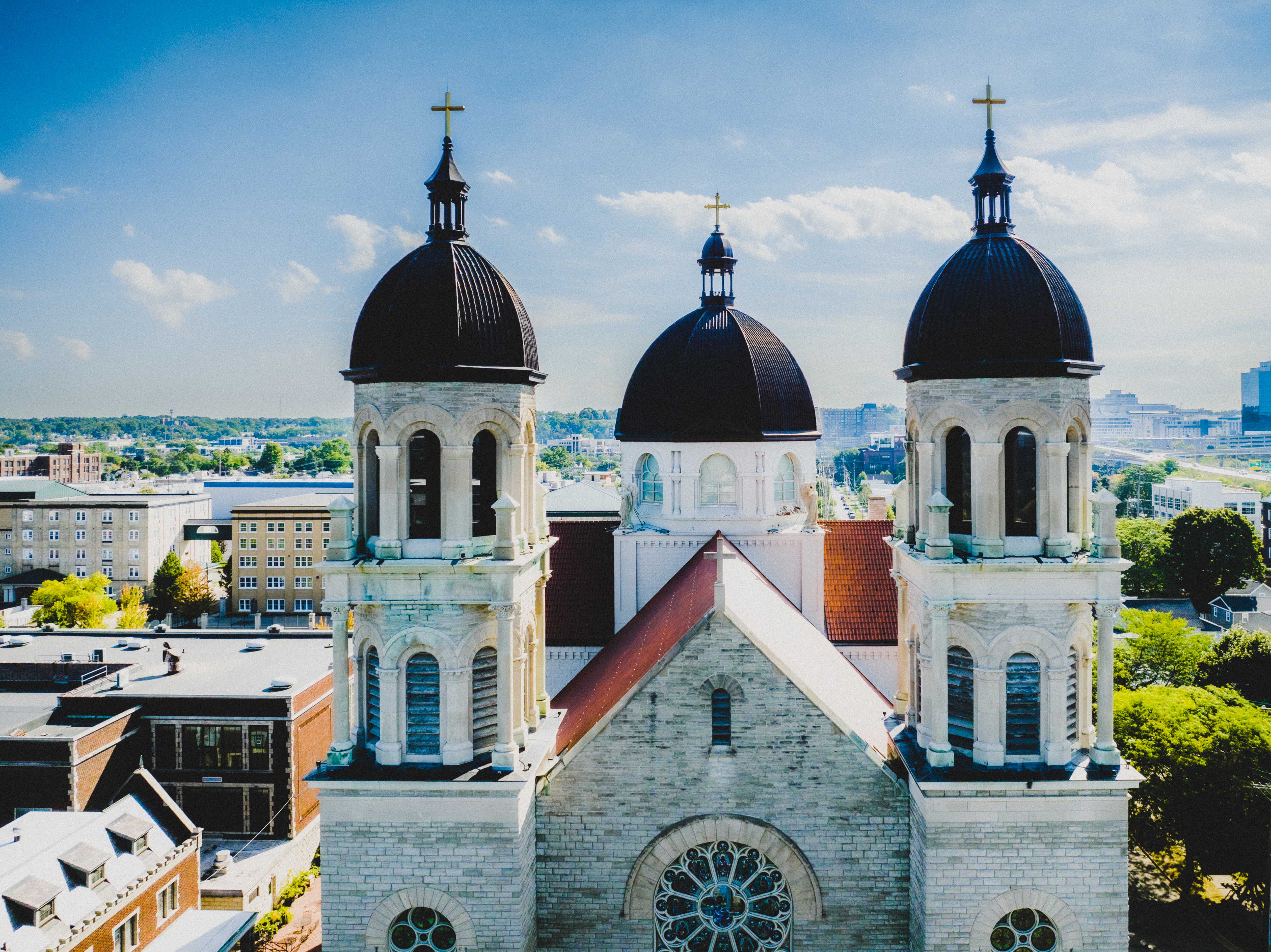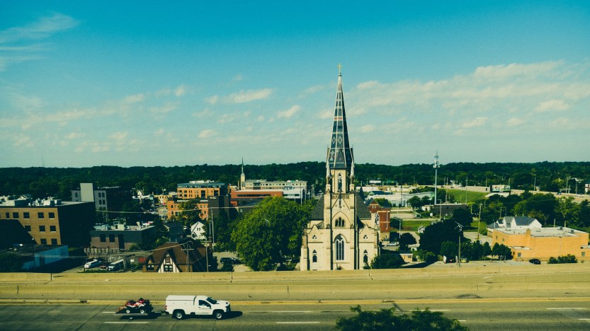 The first couple of images are of the basilica. I processed the first one to look bright and airy and accentuate the oxidized, now black copper of the domes. You can catch glimpses of the larger neighborhood and the buildings of downtown GR on the right. The second image shows off the context more fully. The buildings in the neighborhood would be recognizable to people from 75 or more years ago, but the downtown business district is much more transformed.