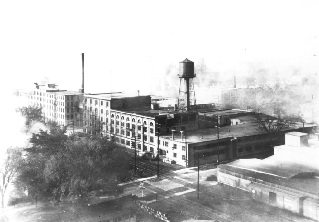 The first image shows the building today. I gave it a 1970s-ish postcard look. The second is a historic one of the factory and neighborhood at they looked around 1930. (Courtesy of Heritage Hall, at Calvin University.) A lot has changed. the water tower of the factory is gone. The factory likely has been converted multiple times, offering office space now. The streets have changed. But you can still see the Basilica of St. Adalbert peeking behind the factory building in both images (behind the water tower in the old image).