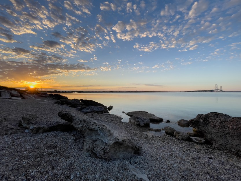 Immediately after the race started and all the riders disappeared into their self-imposed suffering, I drove to the Mackinac Bridge to see if I could capture the sunrise. Here’s one of my favorites, done with my iPhone. This is the beach area of the state park just west of the bridge. The image was made with the super-wide-angle lens on the iPhone.