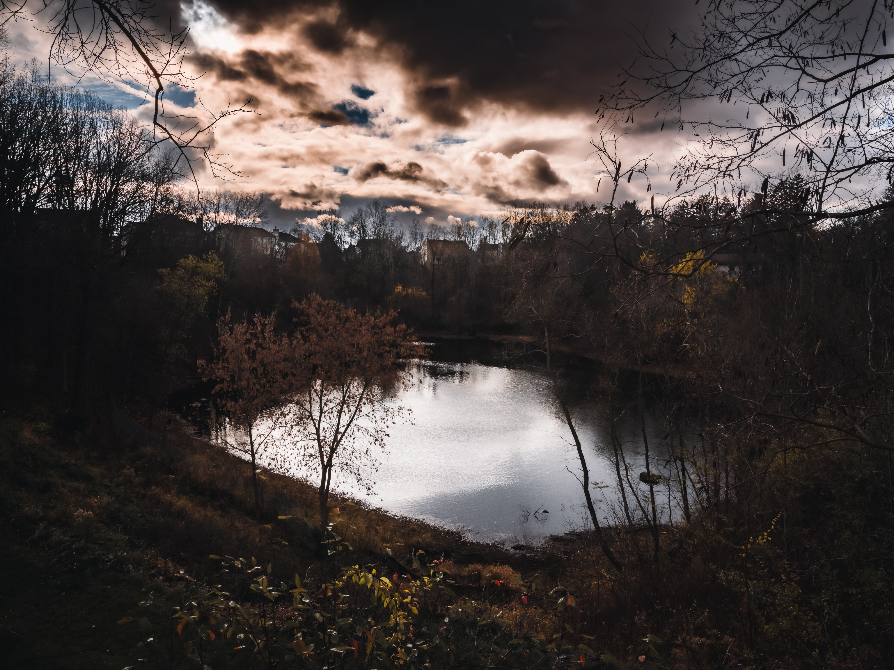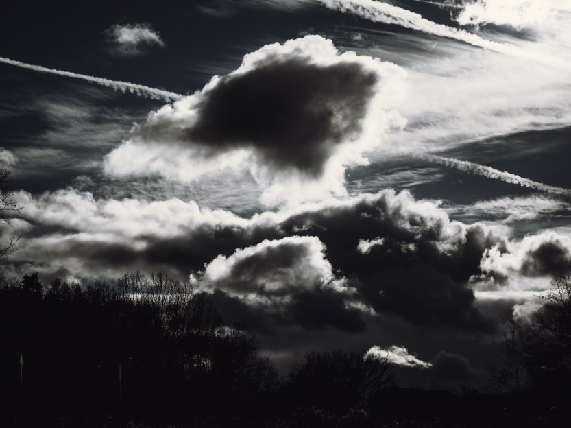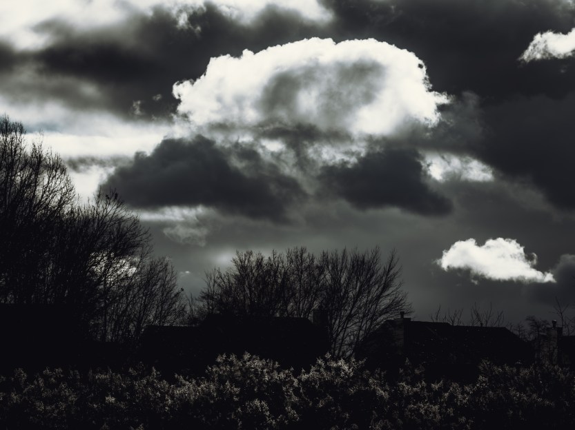 Then, as I walked back to my car, it was the strong contrast of bright sunlight with thick clouds–an in this case, a pond. Instead of trying to fix the contrasty image that resulted, I leaned into it.