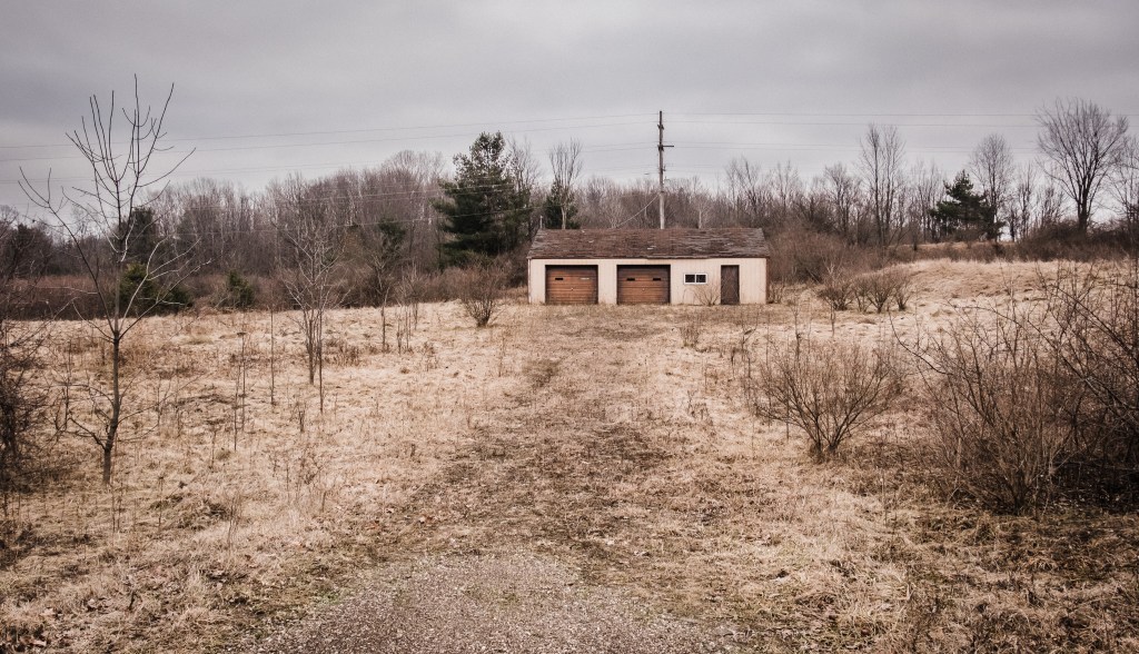 What draws me to images like this is the stories I imagine behind them. Another example, admittedly less mysterious, is this abandoned garage. There’s evidence of a driveway, but just that. There’s no house nearby, unless one that was there was torn down. Most likely this was a small business related to repairing automobiles, one that went out of business.