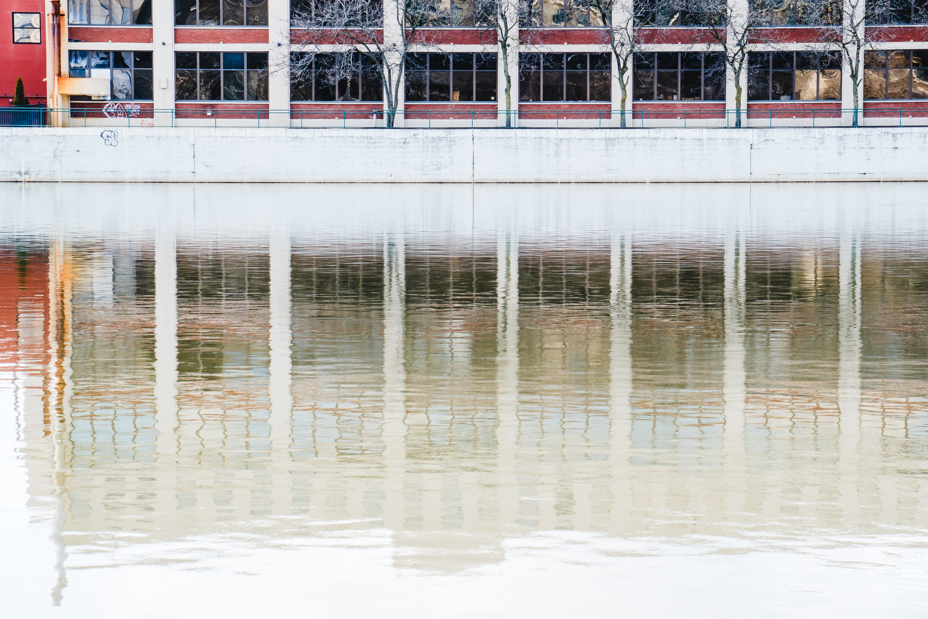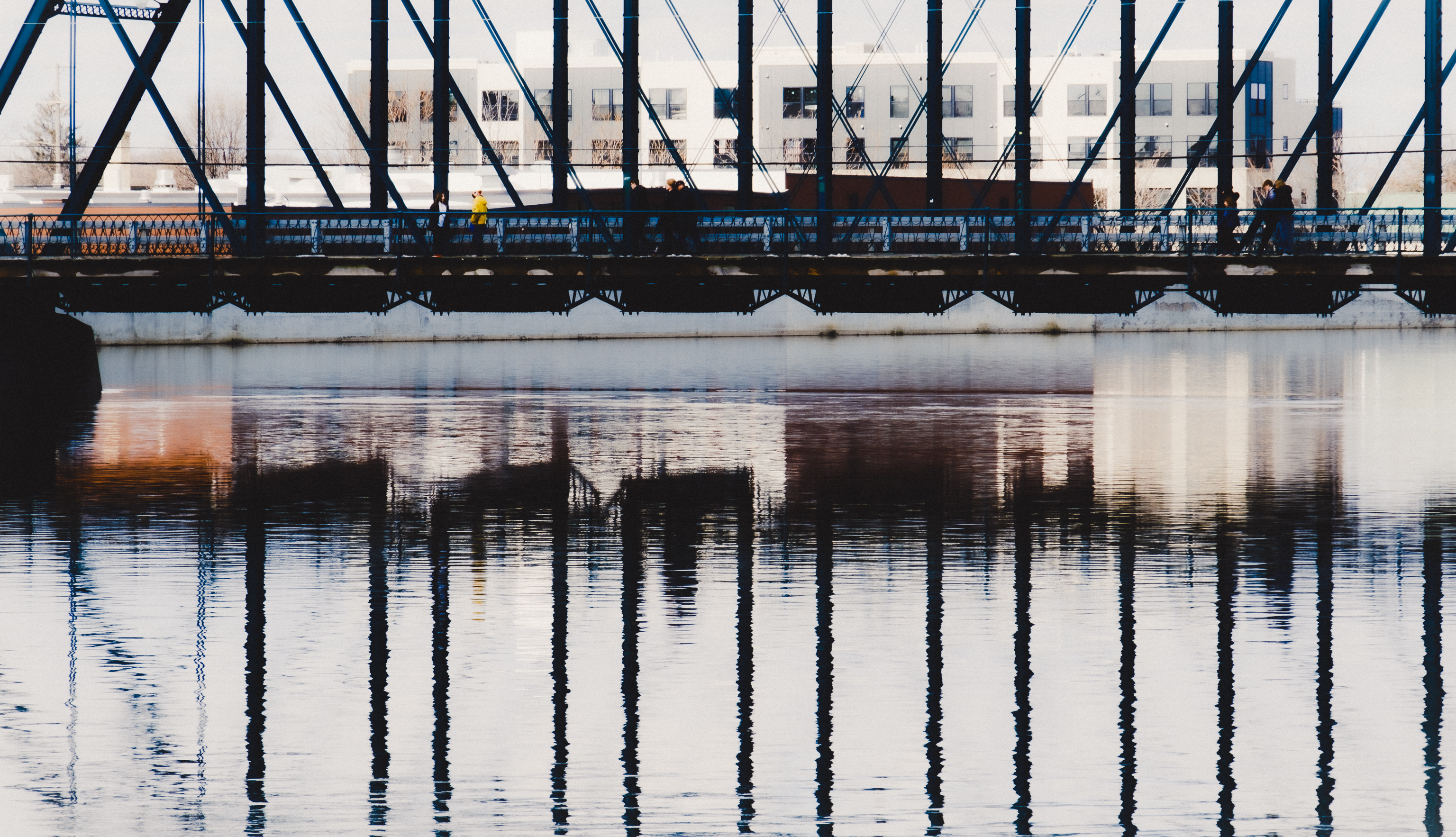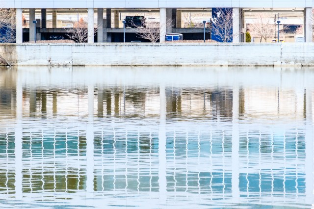 The first thing I noticed, near the city’s blue bridge, was how calm the water was and how nicely it and the bright like showed marvelous reflections of buildings in the water. Here’s an image that’s pretty much straight-up–i.e., processed pretty much realistically, except for pushing the exposure into high key, albeit with a fair bit of contrast.