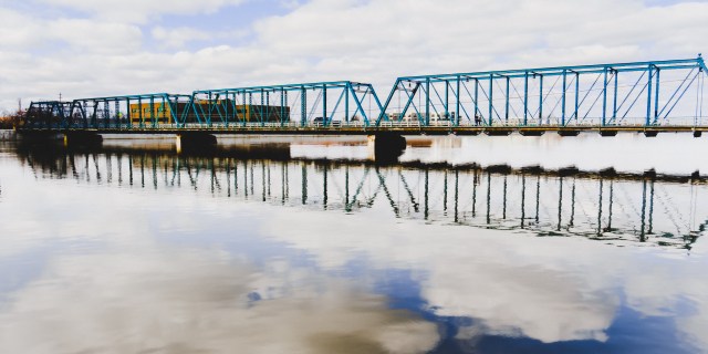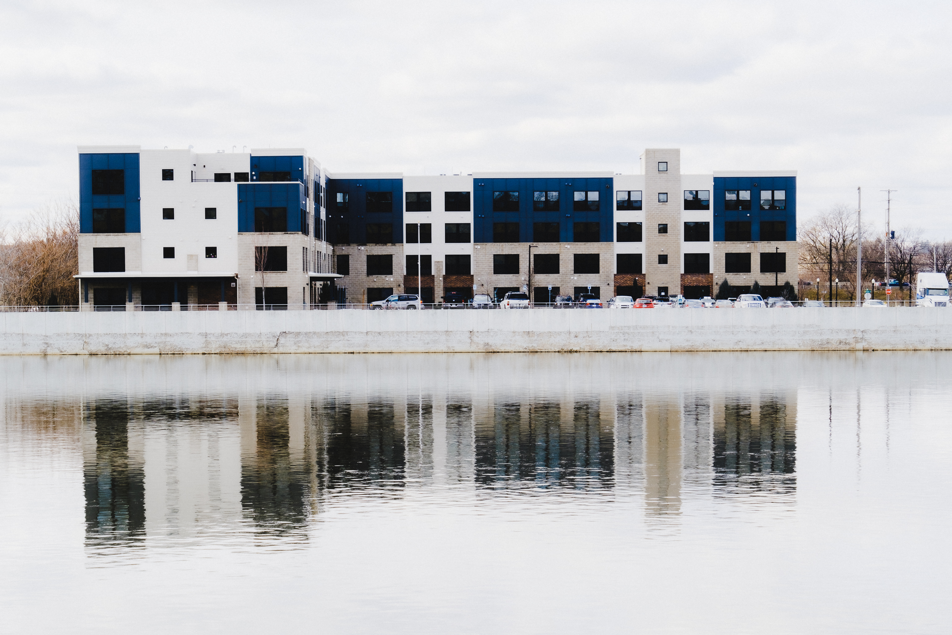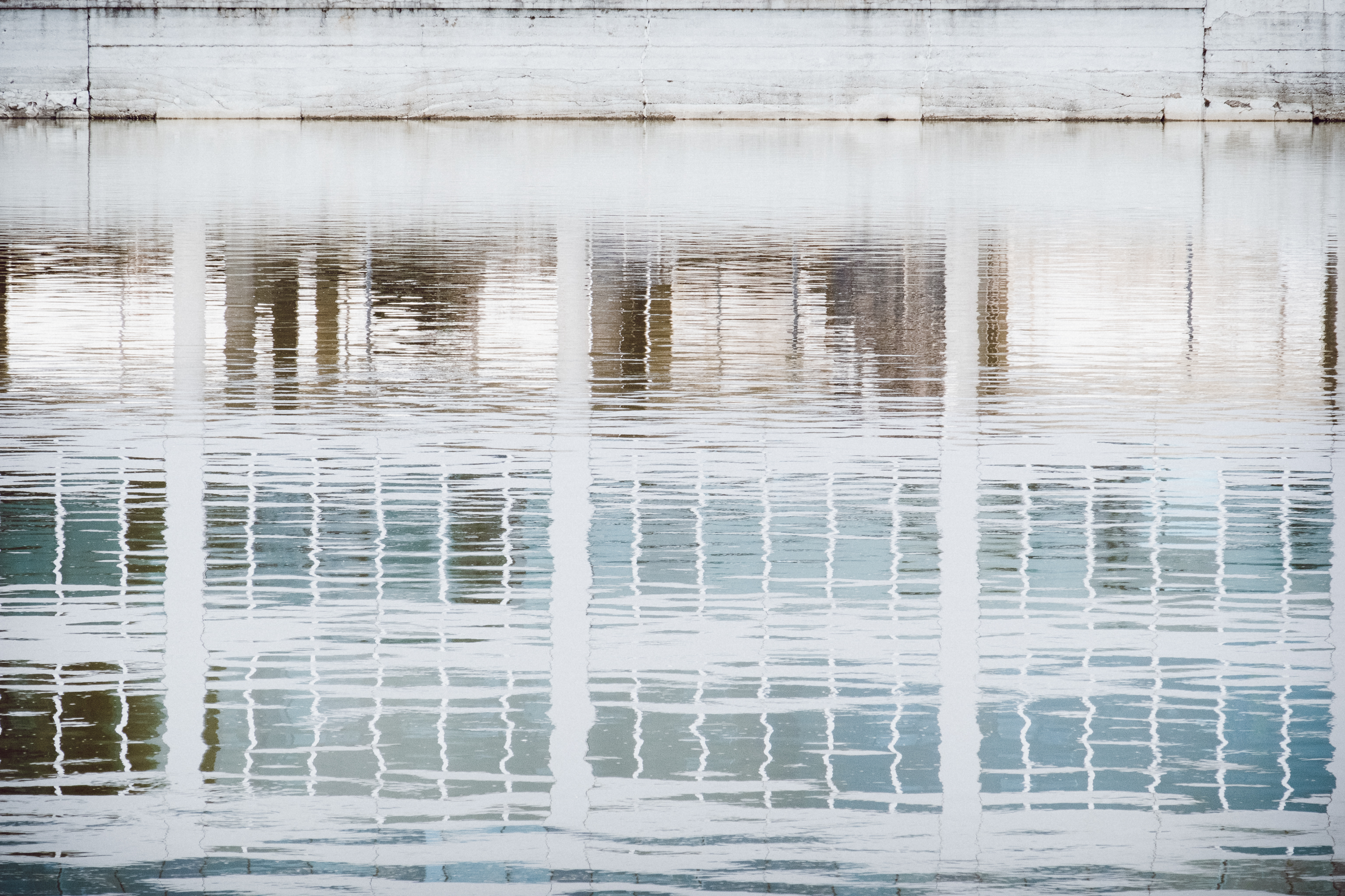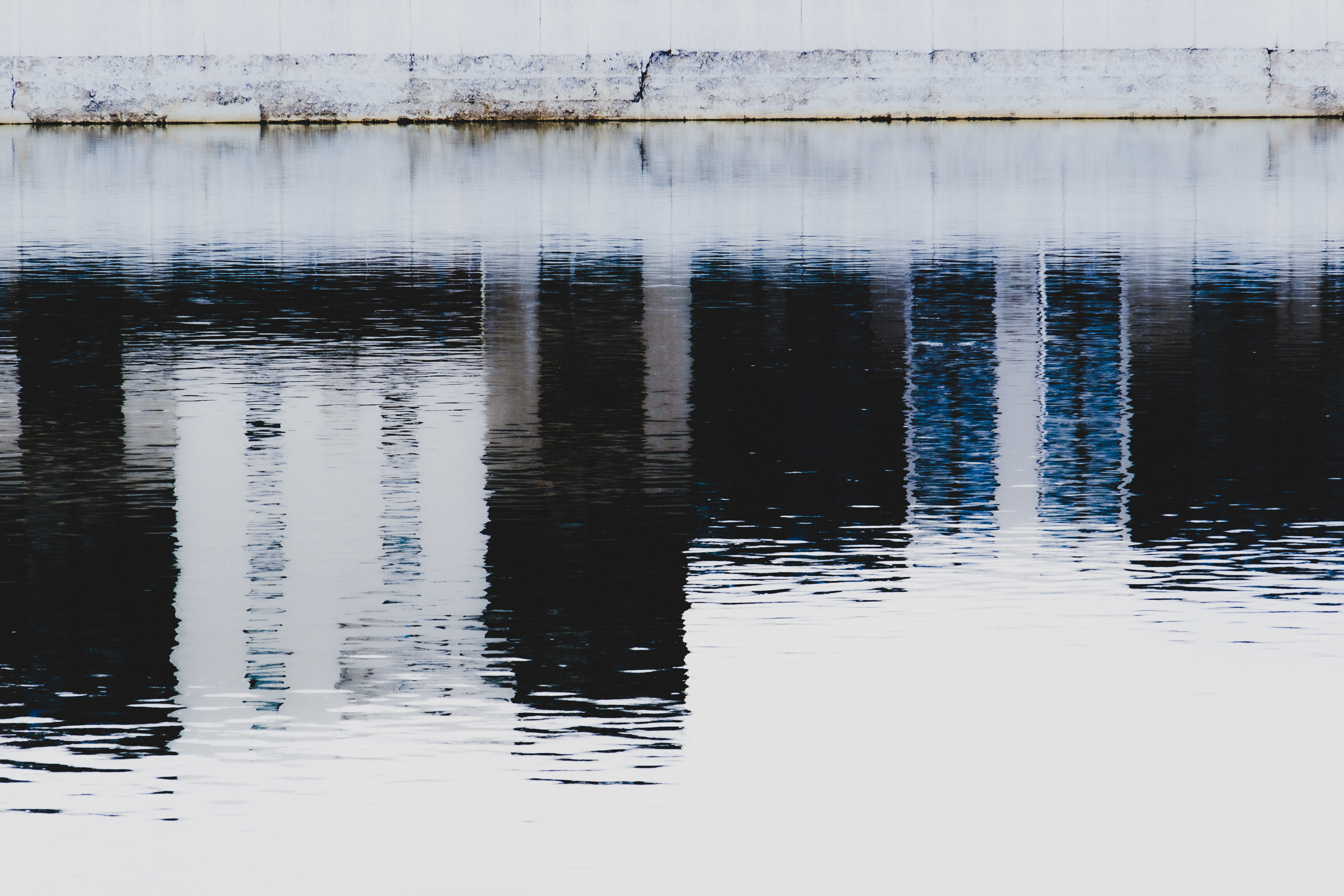 The first thing I noticed, near the city’s blue bridge, was how calm the water was and how nicely it and the bright like showed marvelous reflections of buildings in the water. Here’s an image that’s pretty much straight-up–i.e., processed pretty much realistically, except for pushing the exposure into high key, albeit with a fair bit of contrast.