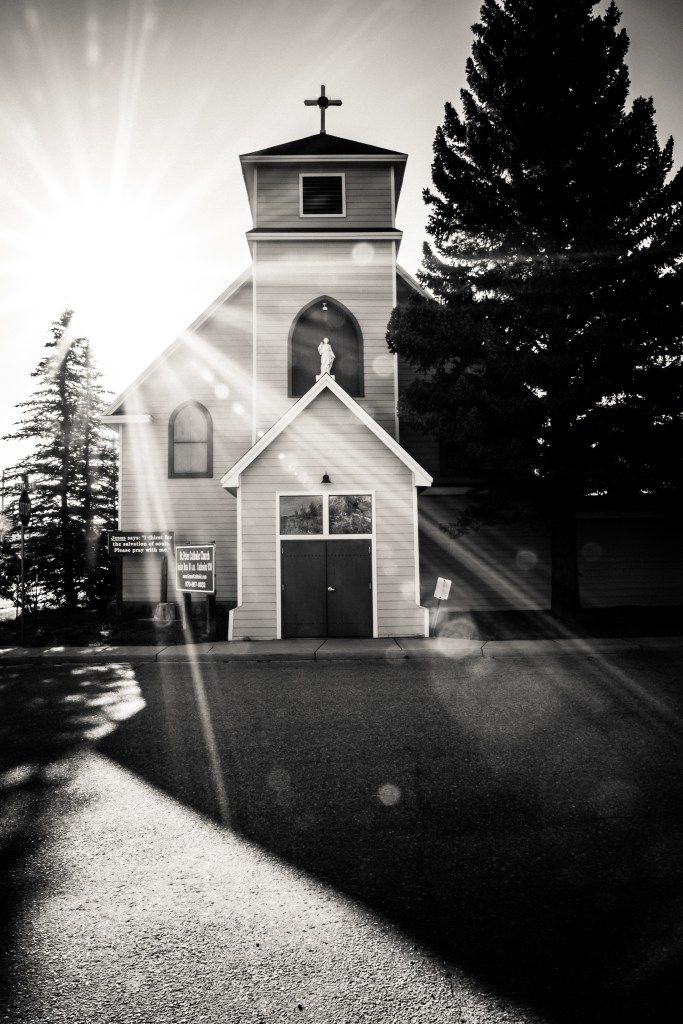 From Kremmling, earlier on the trip, a church and local social organization building, lit up with light.