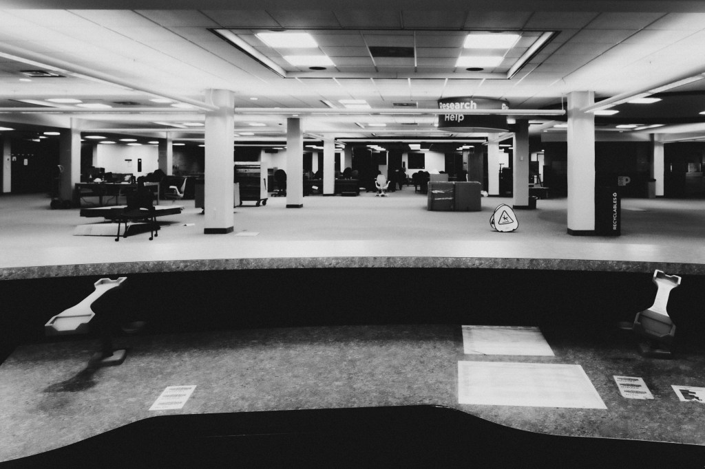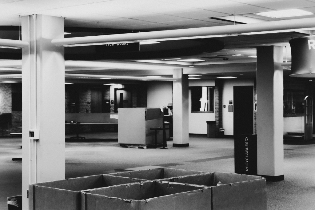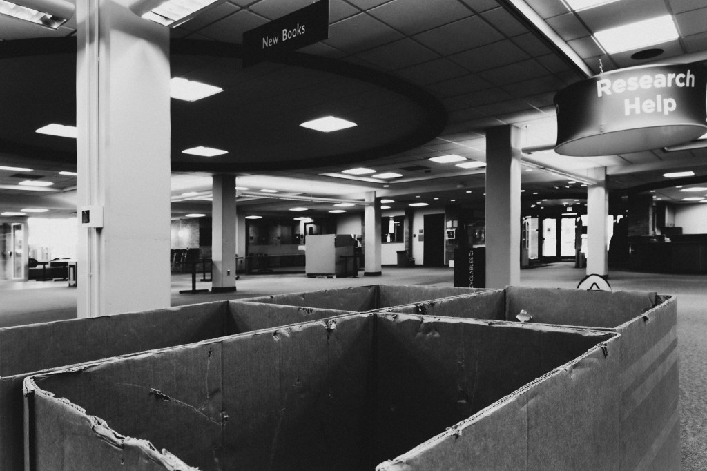 The university library where I work is being renovated over the next year. Floors one to three will be shut down, books and magazines either moved off site or up to the fourth and fifth floors. The exception is the archives on the second floor, where I work. We will still be working there, with a passageway framed-in from our entrance to a nearby stairwell and elevator. We’ll be able to get in and out, as will our “customers,” and hopefully noise and dust will be kept out. The rest of the library staff–and our student, faculty and staff, and local community patrons–will work from the fourth and fifth floors.