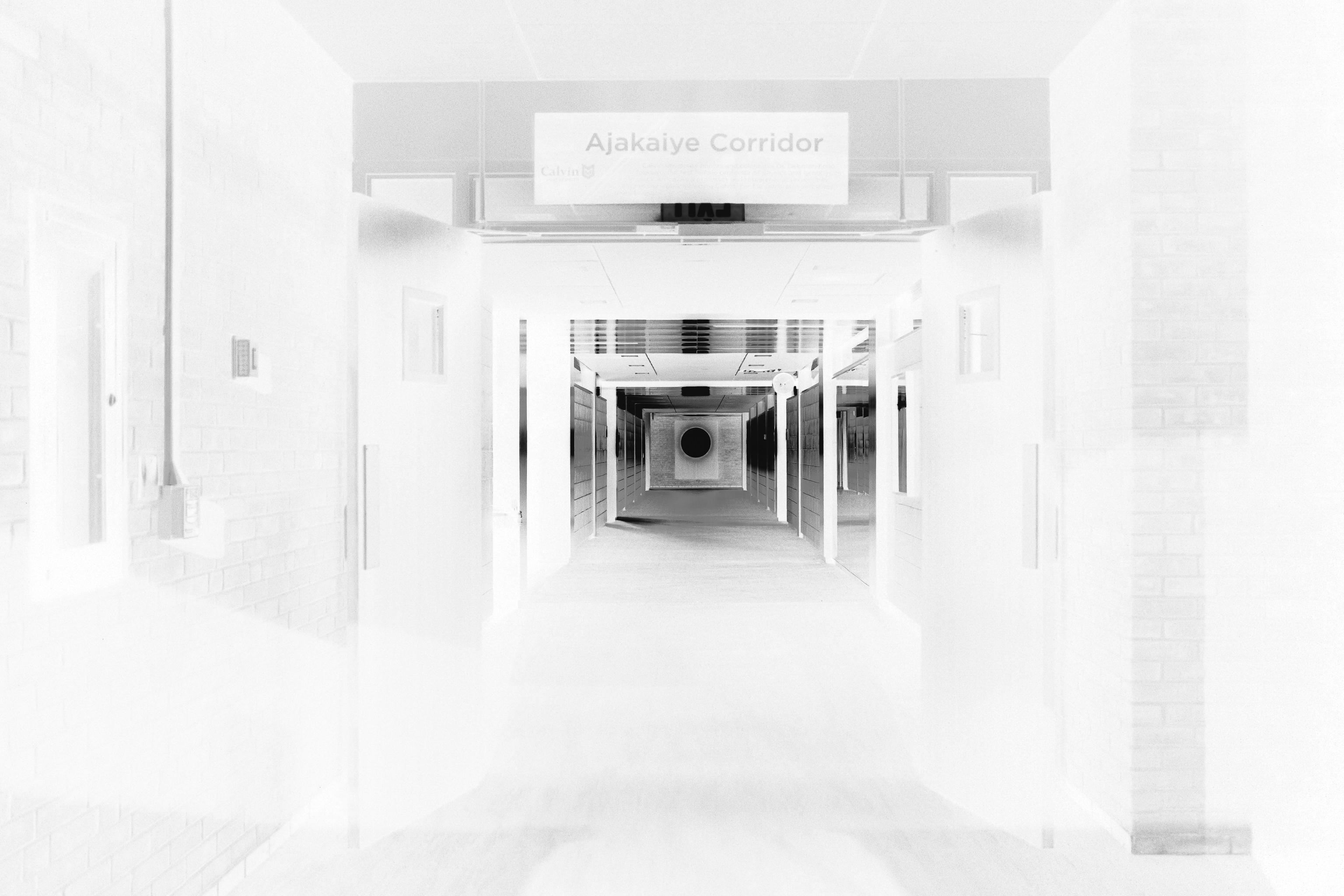 The hallway is a signature piece in Hiemenga, a main corridor for general traffic, including tours of potential students. So, they did it up nice. I took this image at about 6:30 in the morning, when arriving early to prep for an 8am class. I gave it a negative/infrared look. The geometry of the hallway is what struck me, so I removed the color, which seemed a distraction.
